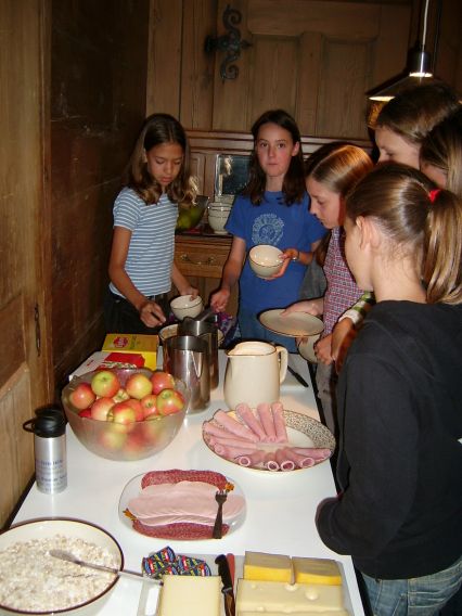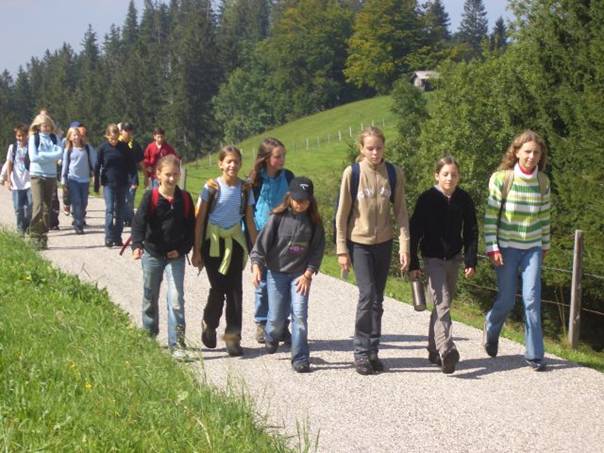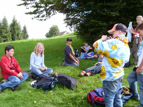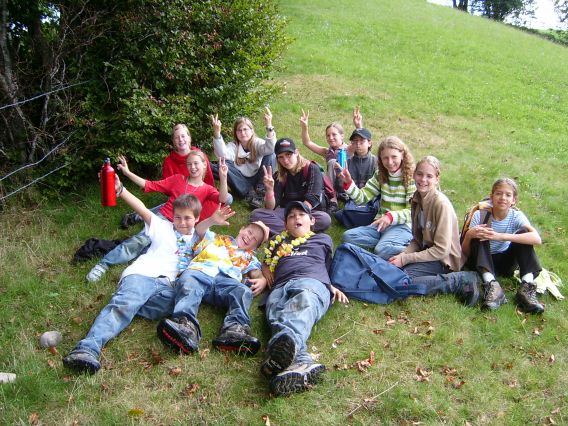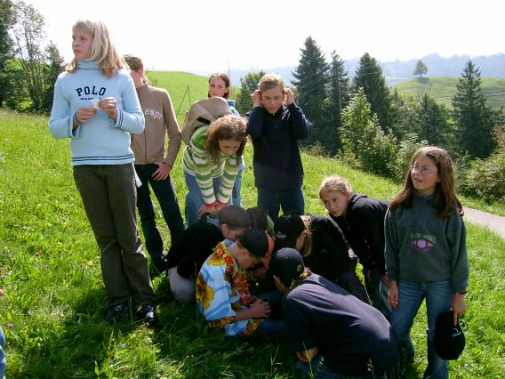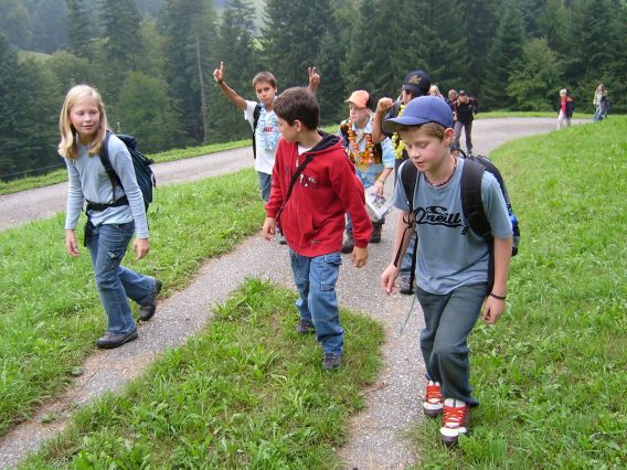 Dienstag, 13. September 2005 Um 7.15 Uhr mussten wir aufstehen und unsere Kleider anziehen. Einigen von uns fiel das ziemlich schwer, denn es war für manche eine kurze Nacht. Aber heute wollten wir eine Tageswanderung unternehmen. Auf das Ahorn, einen Aussichtspunkt im Emmental. Zuerst assen wir unser Frühstück. Es war unser erstes Frühstück, das wir in der Kulturmühle Lützelflüh einnahmen. Das Frühstück war sehr fein, es gab Flöckli, Brot und vieles mehr. Nach diesem feinen Essen machten wir uns parat. Um 8.00 Uhr ging es dann los, zuerst zum Bahnhof Lützelflüh. Dort erwartete uns ein Zug nach Ramsei und dann ging es mit dem Bus weiter nach Wasen. Hier begann unsere Wanderung. Sobald wir aus dem Bus ausgestiegen waren, ging die Wanderung auch schon los! Es ging sehr steil hinauf, das war zum Teil recht anstrengend. Auf der Wanderung sahen wir dann sehr schöne, typische Emmentalerhäuser. Das Besondere an diesen Häusern ist, dass deren Dächer auf allen Seiten weit hinunter fallen und abgeschnitten sind. Als wir ca. eine Stunde und 30 Minuten gelaufen waren, assen wir unseren Zmittag. Jedes Kind hat sich am Morgen ein Sandwich für den Zmittag geschmiert. Das Essen hat allen geschmeckt.