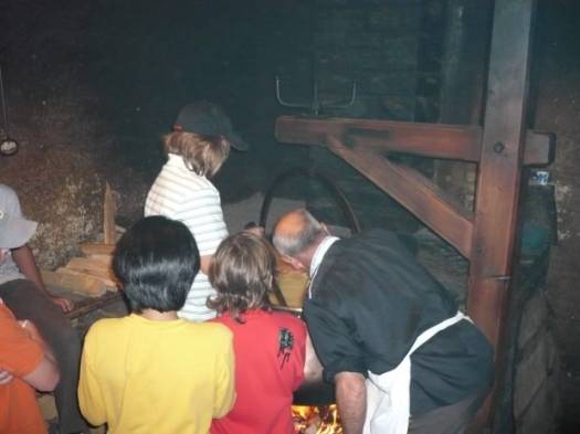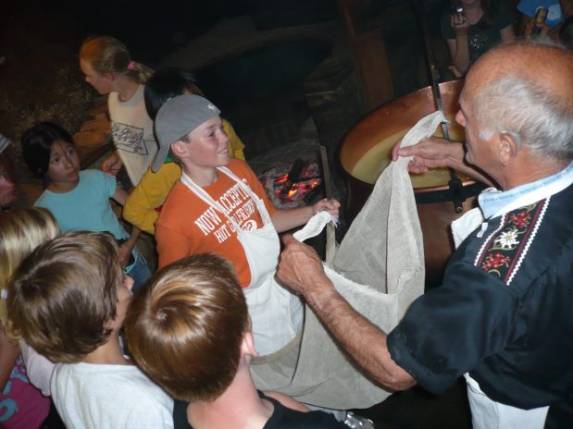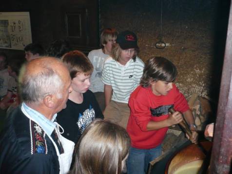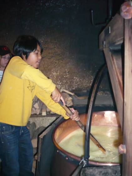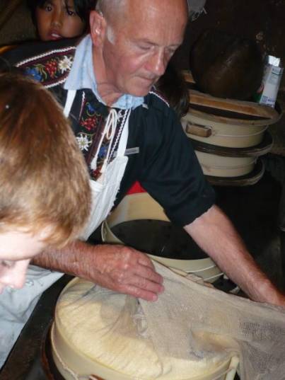 Nach dem Z’mittag holte uns Herr Frauchiger ab. Er würde uns heute zeigen, wie man früher Käse gemacht hat. Wir gingen mit ihm in eine dunkle, heisse und rauchige Käsereistube. Als ich rein kam, musste ich husten. Der Raum war voller Rauch eines Feuers, das in der Ecke des Raumes prasselte. In der Mitte des Raumes stand ein grosser Kupfertopf, gefüllt mit 230 Litern Milch. Herr Frauchiger leerte Wasser und 5 Gramm Lab in die Milch. Lab, erklärte er uns, ist ein Bestandteil des Magens eines Kalbes. Jetzt mussten wir die Milch 30 Minuten ruhen lassen. Unterdessen gingen wir in den Keller und schauten uns den Käse an, den Herr Frauchiger an den Tagen zuvor gemacht hatte. Herr Frauchiger erzählte uns viel über Käse. Er beantwortete uns Fragen wie zum Beispiel: “Warum hat ein Emmentalerkäse Löcher?“ „Weil die Milch, mit der Emmentaler Käse gemacht wird, nicht pasteurisiert ist. Dann bilden die Bakterien Gase und es entstehen Löcher.“ Er verriet uns, dass wir Stöcklikäse machen. 30 Minuten waren vergangen und wir gingen wieder nach oben. Der Käse war inzwischen von einer dünnen Haut überzogen. Herr Frauchiger bat uns, so lange zu rühren, bis die Milch 45Grad warm war. Er zeigte uns verschiedene Instrumente, wie zum Beispiel die Käseharfe und ein Schwingbesen aus Tannenholz.