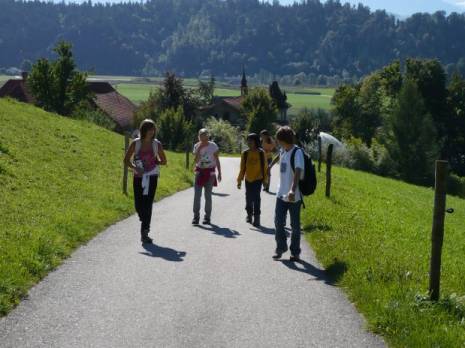 Als ich draussen war, war ich froh, wieder frische Luft einatmen zu können. Schnell ging ich zu meinem Rucksack und trank einen Schluck Wasser. Auch meine Mitschüler tranken Wasser oder Molke, das Nebenprodukt unserer Käseproduktion. Nachher, als ich die Feldflasche versorgt hatte, lief ich zum Eingang der maschinellen, modernen Käserei. Dort konnten wir zuschauen, wie in einem riesigen Gefäss Milch zu Käse verarbeitet wurde. Nach ein paar Minuten führte uns Herr Zwicky in das Untergeschoss. Da waren sehr grosse Räume, die teilweise voll Emmentaler waren. Im ersten Raum sahen wir ein Salzbad, in dem vier Laibe Emmentaler waren. Der nächste Raum war mit den Käsen, die der Käser schon aus dem Bad heraus genommen hatte, gefüllt und im dritten waren die ältesten Käse. Als wir nach dieser Besichtigung das Haus verliessen, kehrten wir zu unseren Rucksäcken zurück. Ein paar Kinder wanderten mit Herrn Egli wieder in die Mühle zurück, aber die meisten waren zu müde dazu. Ich nahm natürlich die bequemere Route mit Bus und Zug. Der Bus fuhr nach Hasle-Rüegsau. Am Bahnhof stiegen wir aus und liefen auf Perron 3. Es ging nicht lange und der Zug fuhr ein. Wir mussten nur noch eine Station fahren. Ich war mega müde. Als wir in Lützelflüh ankamen, trennte uns noch ein kurzer Fussweg von "unserer" Kulturmühle.