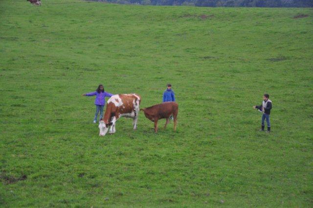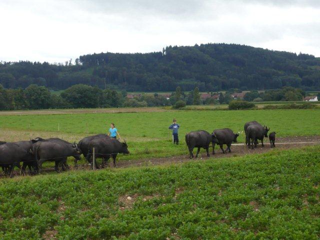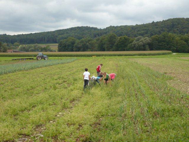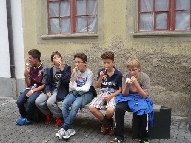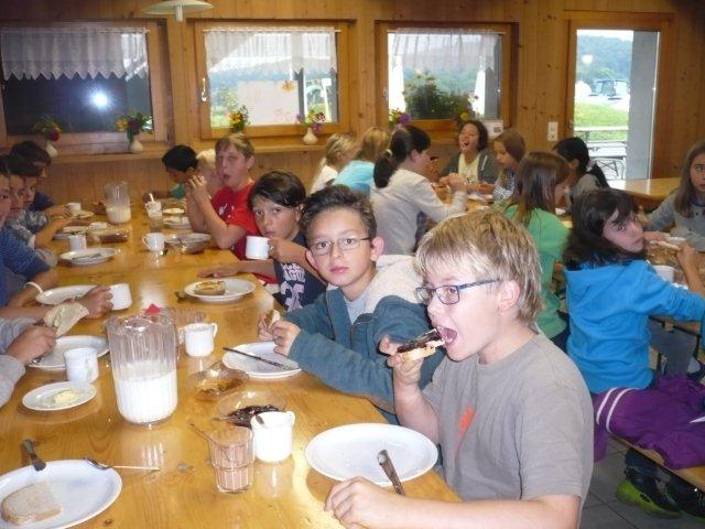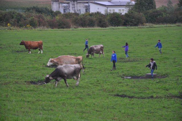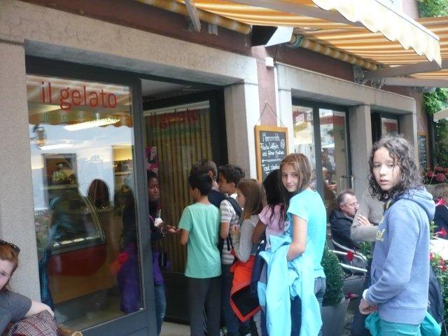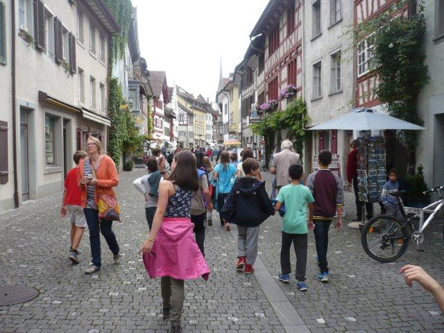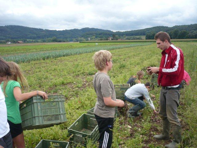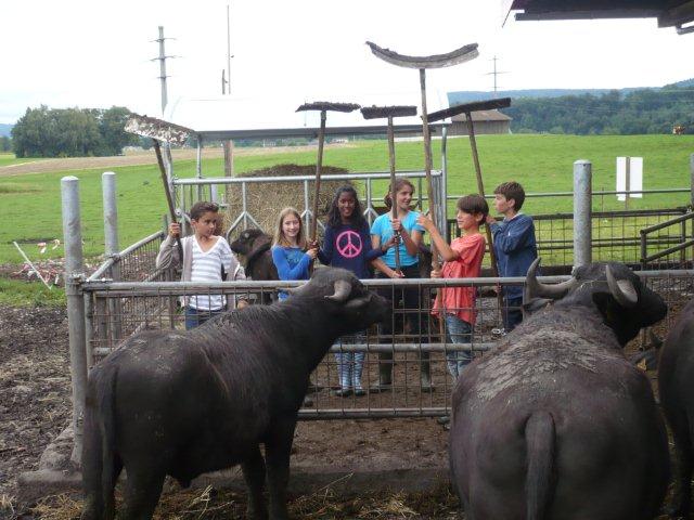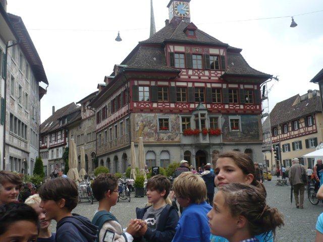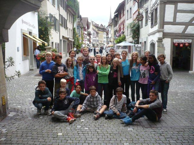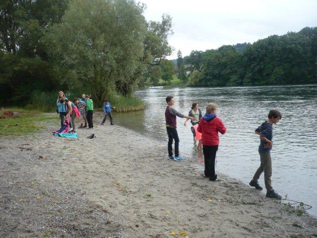 Arja, Meret, Lea, Max, Jason und Noah Gruppenweise kamen die Kinder am Rhein an und Herr Zwicky erklärte uns die erste Aufgabe. In der musste man Steine über das Wasser schleudern. Jede Dreiergruppe konnte dreimal werfen und der Stein des Kindes, das die meisten Sprünge übers Wasser machte, hatte gewonnen. Max schaffte 7 Sprünge und knackte damit den Rekord. Die zweite Aufgabe hatte auch mit Steinen zu tun. Mit der einen Hand musste man einen Holzpfahl berühren mit der anderen schoss man mit einem Stein auf einen Holzstab. Als letztes mussten wir ein Stück Kohle abschiessen, das auf einem Holzpfahl lag. Niemand hatte da Glück, denn keiner traf das Ziel. Danach liefen wir zum Bolderhof zurück und assen unser Zmittag, nämlich ein selber zusammengestelltes Sandwich. Wir konnten noch eine Weile spielen, dann gingen wir schon wieder los. Zu Fuss gingen wir nach Stein am Rhein. Wir sahen schon von weitem ein grosses Tor am Eingang der Altstadt. Als wir endlich an dem Tor angekommen waren, warteten alle bis Herr Zwicky mit uns die Altstadt betrat. Ein paar Kinder kam dieser Ort bekannt vor. Nach einer Besichtigung der Altstadt durfte sich jeder eine Kugel Eis auswählen. Als alle Kinder ein Glace hatten, konnten wir uns für 20 Minuten verziehen, um in Ruhe unser Eis zu essen. Nachher machten wir ein Klassenfoto und gingen zum Bus mit dem Ziel: „Alle sollten im Bus mucksmäuschenstill sein, nur an den Stationen konnten wir flüstern.“ Wieder auf dem Bolderhof musste die Stall-Gruppe die Kühe nicht mehr melken, aber sie auf die Weide bringen und vor allem den Stall ausmisten. Unsere Feld-Gruppe erntete Gemüse. Die Küchen-Gruppe deckte die Tische und schrieb den Tagesbericht. Alle mochten das Essen, denn es gab Tomatensalat, Rüeblisalat und Hackbraten mit Reis und zum Dessert eine Apfelcreme. Nach dem Abendessen spielten wir unser „wer gewinnt“ Spiel. Dabei musste man wieder in verschiedenen Disziplinen möglichst viele Punkte sammeln. Dieser Tag war ein langer, anstrengender, aber erfolgreicher und schöner Tag.