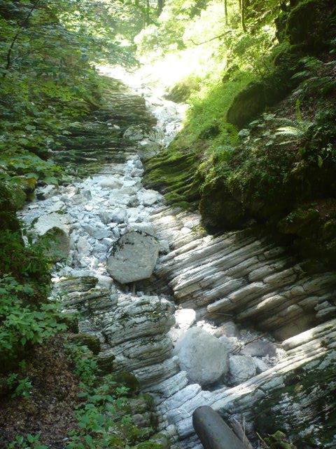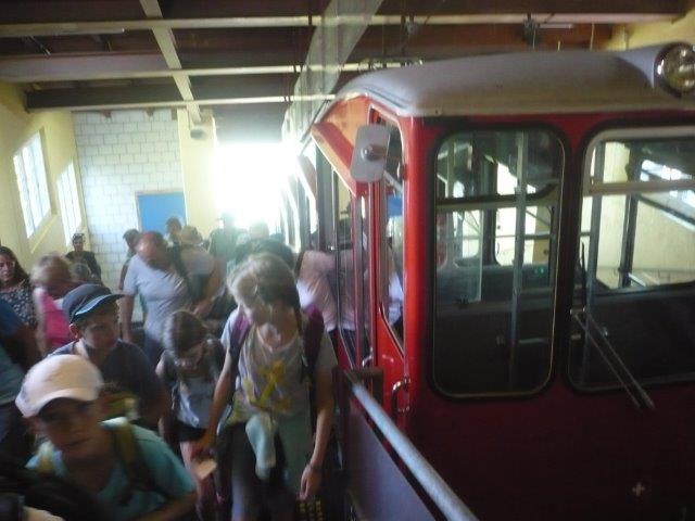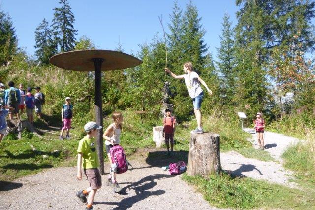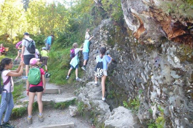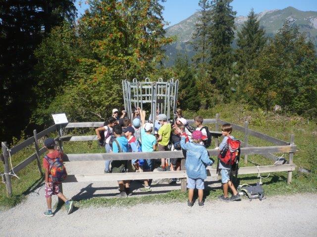 Als wir endlich ankamen stellten wir fest, dass die Thurfälle zur Zeit kein Wasser haben, aber dafür haben wir schönes Wetter. Wir haben aber gesehen, wie stark das Wasser ist, weil es riesige Einbuchtungen, unten wo das Wasser aufprallt, gab. Auf dem Rückweg ist einem Kind die Flasche ausgeleert, so dass sein Rucksack ganz nass war. Jemand anderes musste seine Sachen tragen. Dann gingen wir zur Iltios Bahn und fuhren hoch. Die Bahn war eine Standseilbahn. Als wir oben angekommen sind, gingen wir nach rechts, zwei Posten zurück im Klangweg- Unser erster Posten war der Flötenzaun, dort gab es gebogene Flöten aus Metal, die rund um einen Metallring angeordnet sind.