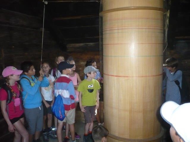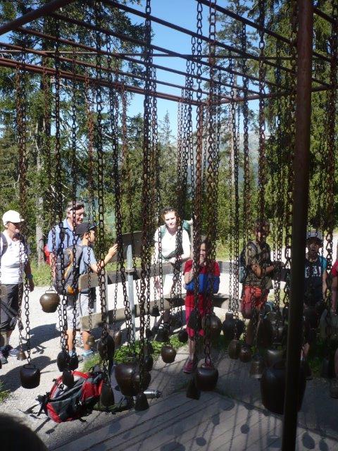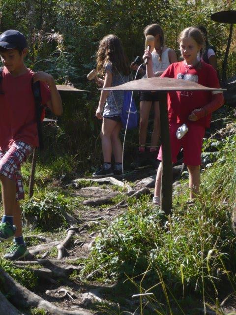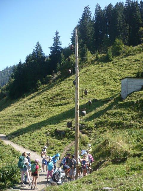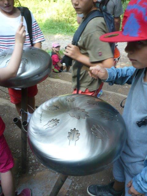 Ein Mädchen sagte, dass der Klang an eine Musik eines Films erinnert, wenn ein Traum vorkommt. Wir finden, dass das stimmt. Bei jedem einzelnen Posten gibt es so einen Klang. Nur als Info: Wir gingen nicht den ganzen Klangweg! Dann gingen wir zum nächsten Posten. Beim vierten Posten war „Der Schellenbaum“. „Der Schellenbaum“ besteht aus vielen Glocken, die hängen an einem Stamm. Die Glocken waren verbunden mit Seilen. Wenn man die Seile zog, dann gab es einen Klang. Man kann sogar ein Lied spielen und das hiess: Bruder Jakob Bruder Jakob schläfst du noch… Übrigens gab es auch Noten die halfen. Um die Noten zu lesen, gab es bei jeder Note eine Farbe und dieselben Farben auch bei den Seilen .So zogen die Kinder die Farbe, die sie am Seil haben und es wurde ein Lied. Wir liefen nun zum nächsten Posten. Bei diesem Posten ging es um Felsentöne. Es gab Löcher in den Wänden und die waren unterschiedlich gross. Gross und klein! Wenn man seine Hand drauf schlug, dann gab es einen sanften, tiefen, matten, schönen Klang. Es gab noch weitere Posten.