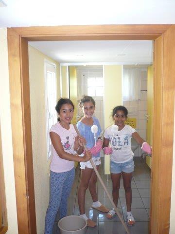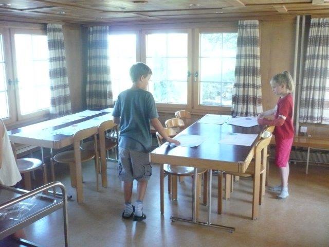 Dann mussten wir unsere Zimmer aufräumen, denn die waren ziemlich chaotisch. Nach dem Aufräumen sahen die Zimmer schon viel besser aus. Danach mussten wir unsere Rucksäcke packen, doch manche Kinder mussten sich beeilen, denn die mussten noch putzen. Sie „durften“ die Zimmer, den Esssaal, den Gang und auch die Klos putzen. Sie haben es sehr gut gemacht!
