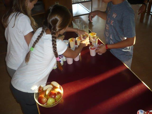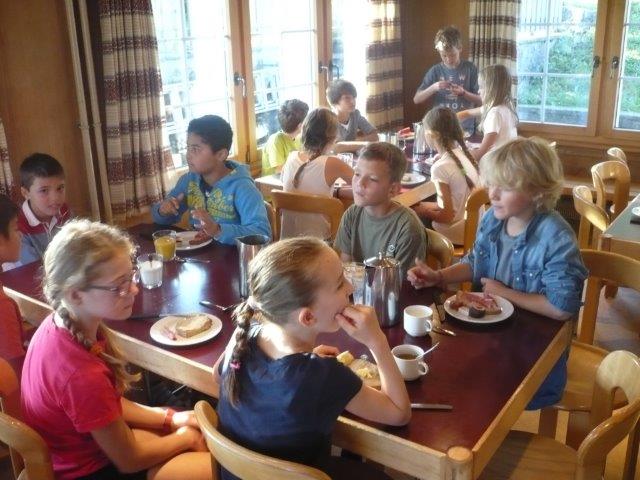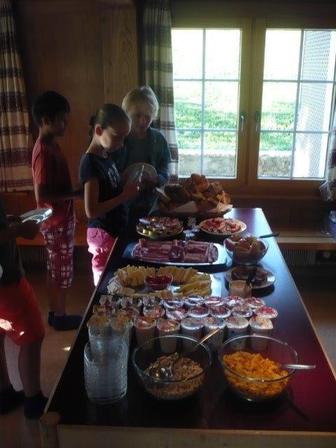 Am ersten Morgen sind manche Zimmergruppen schon um 07:00 Uhr aufgewacht, also um die gleiche Zeit als die Kochkinder aufgeweckt wurden. Die Kinder, die nicht kochen mussten, hatten nun Zeit sich fertig zu machen, während die Kochkinder schon das Frühstück vorbereitet haben. Zum Frühstück gab es: verschiedene Käse, Salami, Wurst, Schinken, Joghurt, Brotscheiben, Butter gesalzen und normal, Müesli, Tomaten, mehrere Marmeladen und heisses Wasser und Milch um sich einen Tee oder einen Kakao zu machen und Orangensaft gab es auch noch.