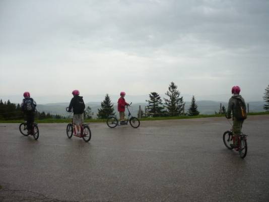 Endlich kamen wir beim Ahorn-Restaurant an. Ich war froh, denn ich hatte keine Lust mehr zu wandern. Davor wartete unser Trottinett-Vermieter auf uns. Es gab blau-grüne und rote Trottinetts. Doch bevor wir diese bekamen, mussten wir die Regeln besprechen. Ich wollte lieber gleich losfahren. Zuerst mussten wir aber eine Probefahrt machen, um bremsen und steuern zu üben, obwohl wir das schon konnten.