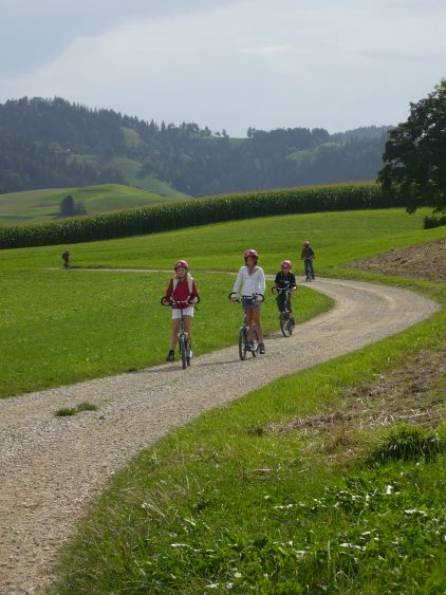 Es war ein herrliches Gefühl runter zu brausen, aber dieses verschwand bald. Vor uns lag eine Kieselsteinweg. Mein Trottinett fing an zu rumpeln. Das fand ich gar nicht bequem! Unterwegs hielten wir ein paar Mal an, um niemand zu verlieren. Als wir weiter unten waren, rutschte ich dreimal aus, konnte mich zum Glück aber noch rechtzeitig auffangen. Als wir unten angekommen waren, versorgten wir die Trottinette. Im Bahnhofschuppen standen schon ungefähr zwanzig davon. Als Frau Müller unsere Trottinetts näher zusammen schieben wollte, kam sie versehentlich an den andern an. Wie bei einem Domino kippten alle Trottinetts um. Das fand ich lustig.