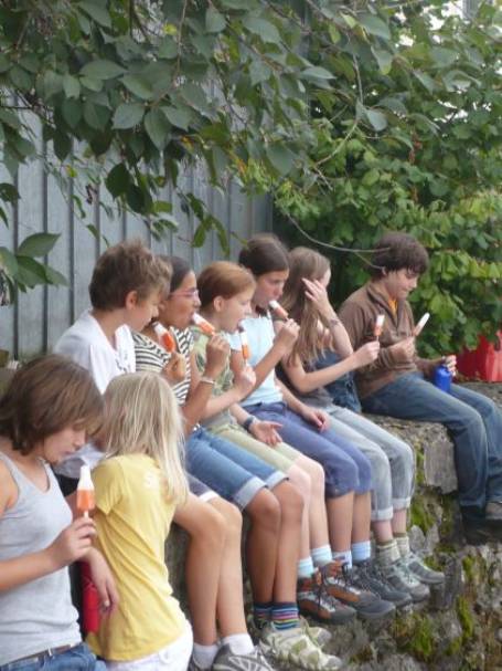 Ich kletterte auf den näheren Holzstapel. Ich war froh, dass Larissa auch auf diesem Holzstapel ass. Als Anthony fertig gegessen hatte, stand er auf und warf kleine Steine gegen Bäume. Mit der Zeit kamen immer mehr Knaben und machten ihm das nach. Herr Egli schaute uns gespannt zu. Nach ein paar Minuten ging er zu den Jungs und sagte: „Die drei Jungs, welche den Baum mit einem Stein treffen, bekommen von mir ein Glacé!“ Noah, Tyler und Yarza waren die drei Glücklichen. Sie bekamen ihr leckeres Glacé am Bahnhof. Später packten wir unsere Sachen ein und liefen weiter.