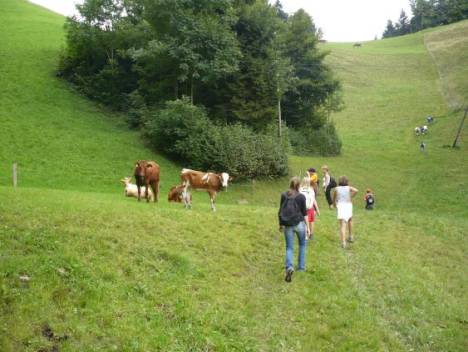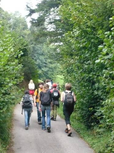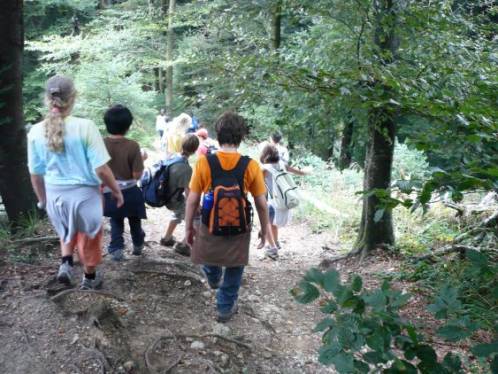 Ein paar Kinder waren sehr weit voraus gelaufen, deshalb mussten sie lange warten. Ich war mit Julia ungefähr in der Mitte der Reihe, in der sich sehr grosse Abstände zwischen den Grüppchen gebildet hatten. Nach diesem Feld ging es gar nicht immer flach weiter, sondern mal steil rauf und wieder steil runter. Ich fand natürlich den Wegteil, der steil runter ging lustig. Aber wenn der Weg praktisch nur aus Erde und Wurzeln bestand und steil bergauf ging, machte es mir auch Spass.