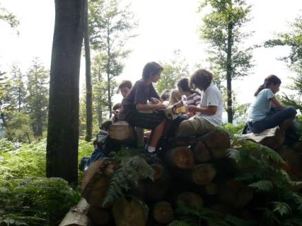 Als wir alle schon riesigen Hunger hatten, sagte Herr Zwicky: "Ihr könnt auf einem der zwei Holzstapel essen." Alle packten ihr feines Mittagessen aus und verteilten sich auf den zwei grossen Holzstapeln.