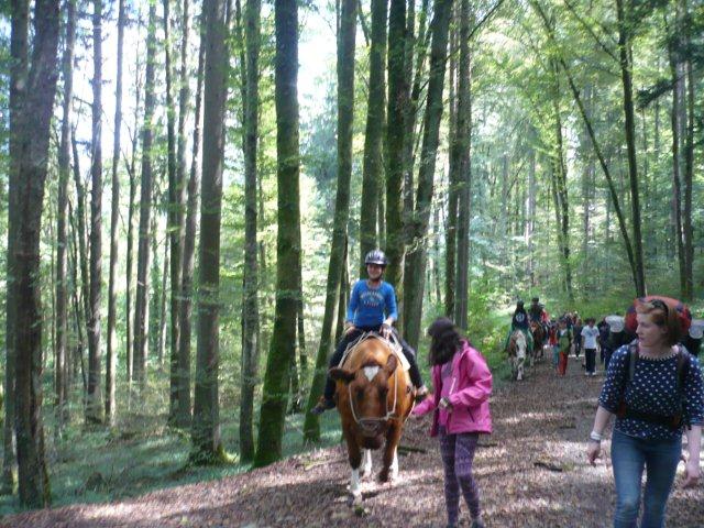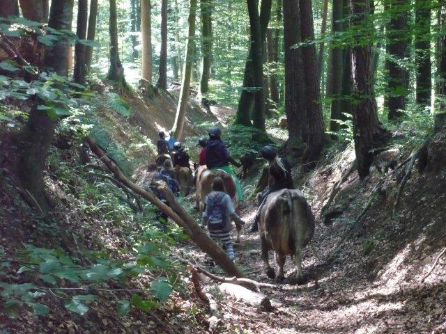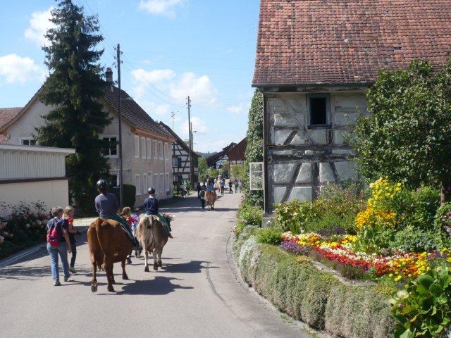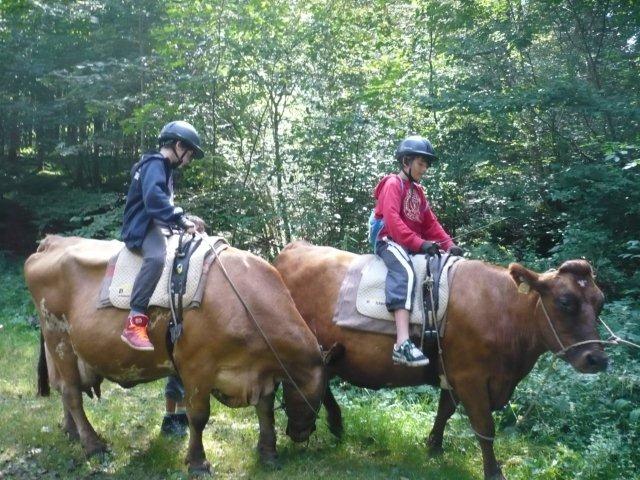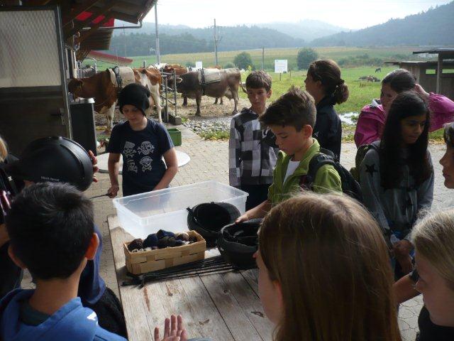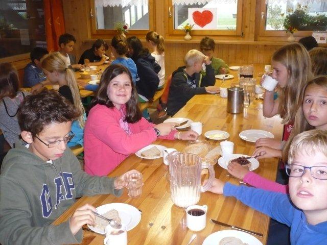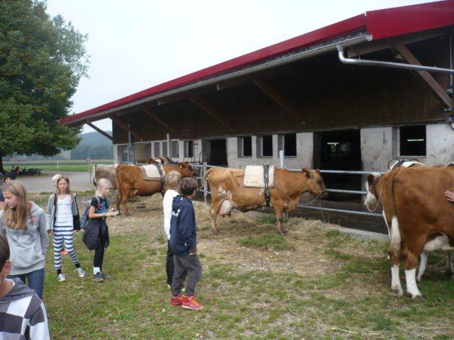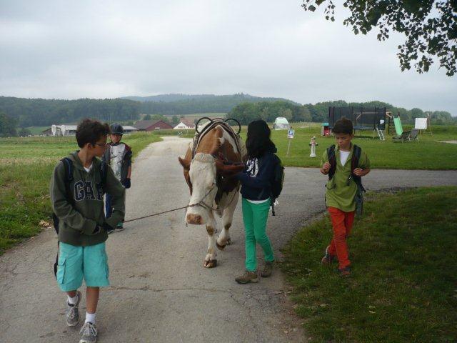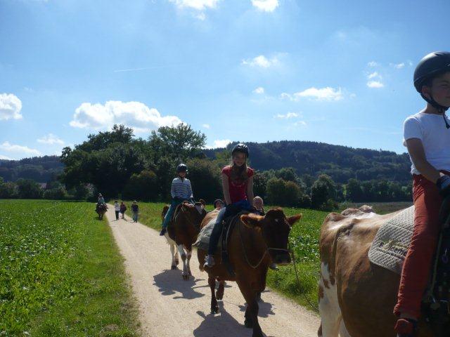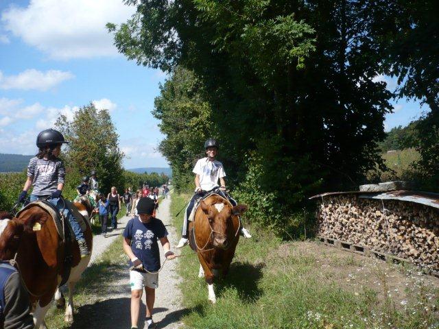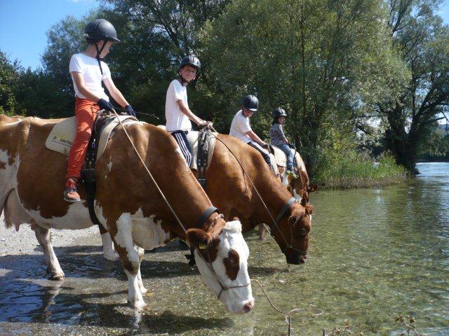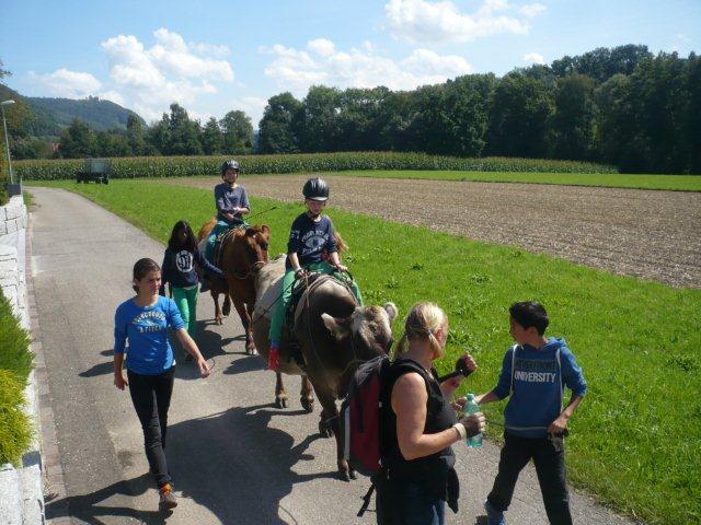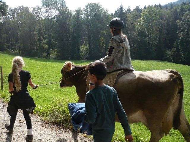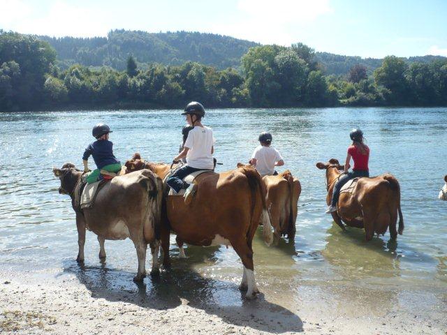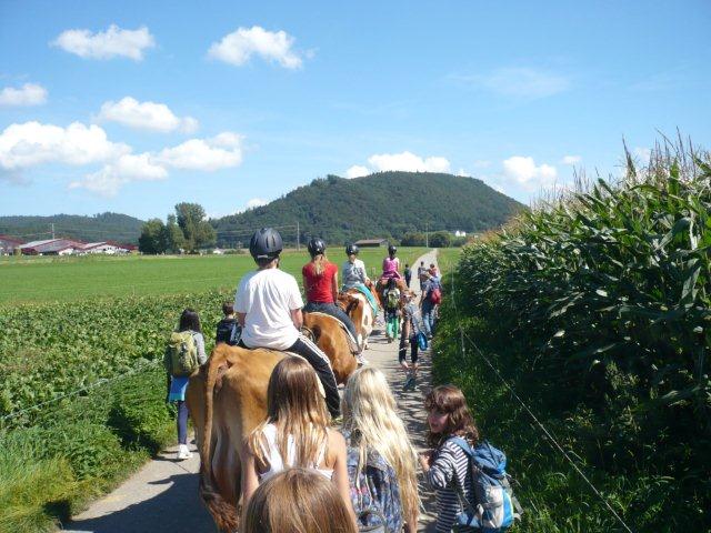 Josephine, Hana, Sebastian, Rafael, Andrina und Jonathan Nach dem Frühstück ging es endlich los, wir durften mit den Kühen reiten gehen. Draussen stand eine Frau, die wir noch nicht kannten. Sie war eine Naturpädagogin. Die Einführung ging gut 15 Minuten. Sabine erklärt uns, wie die Kühe fühlen und reagieren. Als die Einführung fertig war, führten wir die Kühe ein kleines Stück zu Fuss. Wir gingen gut 50m, als ein Schrei ertönte. Wir schauten uns um und da sah man ein Mädchen, das am Boden kauerte und sich den Fuss hielt. Sie schluchzte: „Eine Kuh ist mir auf den Fuss gestanden.“ Weil sie nicht mehr gut selber laufen konnte, durfte sie als erstes auf der Kuh reiten. Wie sich später herausstellte, war zum Glück nichts Schlimmes passiert, denn sie konnte schon bald wieder laufen. Nach einer kurzen Zeit durften wir alle selber reiten. Einer der 4er-Grüppchen sass auf der Kuh und musste sich voll und ganz auf das andere Kind verlassen, das die Zügel zog, denn dieses Kind steuerte und lief neben der Kuh her. Die Kühe wollten immer wieder Grass fressen, doch wir hielten sie davon ab. Nach einem langen Marsch erreichten wir den Wald. Links von uns ging der Hang hoch und rechts von uns ging es steil runter. Die Kühe gingen rechts am Weg entlang. Viele Reiter hatten Angst, dass die Kuh hinunterstolpern könnte. Sabine sagte, dass das nicht passiert, weil die Kühe Bergtiere sind. Doch dann rutschte trotzdem eine Kuh mit den Hinterbeinen ab und rutschte aus. Sie hangelte sich an der Kante des Weges entlang und der Reiter reagierte blitzschnell und sprang mit einem Satz von der Kuh. In dieser Zeit hielt ein anderes Kind tapfer die Kuh. Glücklicherweise ging alles gut aus. Den Kindern passierte nichts und der Kuh auch nicht. Nachher ritt die Truppe weiter in Richtung Picknickplatz, wo wir die Kühe an Bäumen festbanden und ihnen Harasse mit Heu hingelegt haben. Beim Picknick spielten manche Quartett, andere redeten. Nach dem feinem Mittagessen gingen wir zu den Kühen zurück, die gierig alles Heu aufgekaut hatten. Die Kuhflüsterin hatte uns vor dem Mittagessen erzählt, dass es nicht weit von dieser Lichtung einen Zauberweg gibt. Kribbelig wie wir waren, bestiegen wir die Kühe. Sie trotteten wieder mit guter Laune auf den Zauberpfad zu. Nach einer Weile blieb die Kuhflüsterin stehen und schmunzelte: „ Der Zauberpfad ist ein dünner, schmaler Weg, den hat unsere Kuh Andrea zu bockigen Zeiten entdeckt.“ Der Pfad war holprig und hatte ein paar Hindernisse, aber er war wirklich zauberhaft. Als wir den Pfad verlassen hatten, wurden die Kühe wieder ätzend. Hinter dem nächsten Maisfeld tauschten wir wieder die Plätze. Beim Tauschen stand eine Kuh einem Jungen dreimal auf den genau gleichen Fuss. Auch dieses Mal war es zum Glück nichts Tragisches. Dem Jungen geht jetzt wieder gut, er springt schon wieder wie ein junger Hase herum. Dann war es so heiss, dass wir anfingen zu schmoren. Später bogen wir in Richtung Rhein ab und hielten bei einer kleinen Bucht. Die Reiter wateten mit den Kühen durch das kühle Wasser des Rheines. Wir gingen danach zurück zum Bauernhof, wo wir die Kühe absattelten. Alle Lehrer waren stolz auf uns, dass wir so gut mit den Kühen umgegangen sind. Nach einer “kurzen“ Pause begannen unsere Ämtchen wieder, wo die eine Gruppe fleissig Bohnen gesammelt hat. Zum Abendessen gab es als Salat einen Büffelmozzarella Salat mit Mozzarella von den Büffeln auf diesem Bauernhof. Das war sehr fein. Nach dem Essen gab es auch noch einen feinen Dessert, nämlich Glace mit Schlagrahm. Einige Kinder haben bis zu sieben Kugeln Glace gegessen. So ging der letzte Lagertag mit vollen Bäuchen und viel Spass zu Ende.