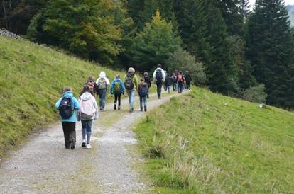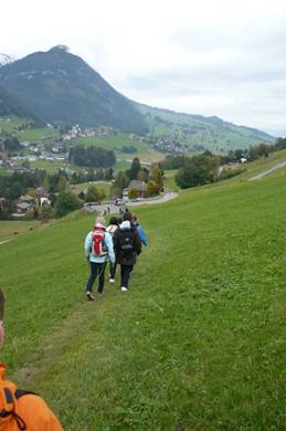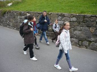 Zum Glück war es ziemlich gutes Wetter, obwohl es bewölkt war. Einige Kinder rannten sofort los und kletterten unter einem Zaun durch, einige gingen auch durch ein kleines Tor bei der Treppe. Als wir über die Wiese gekommen sind, liefen einige ziemlich langsam, aber die anderen liefen ziemlich schnell. Der Weg war lustig und es gab oft kleine Gruppen, die immer zusammen liefen.