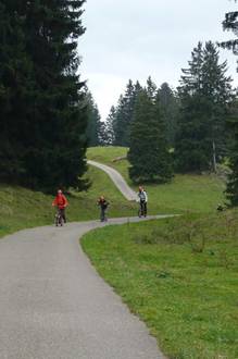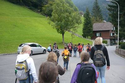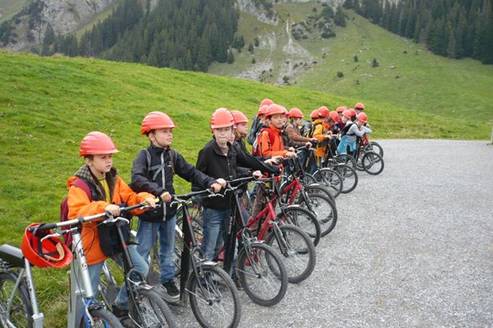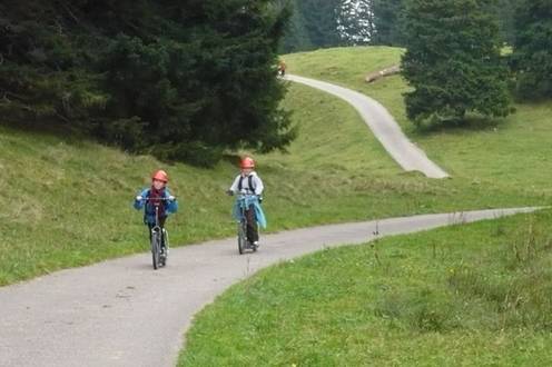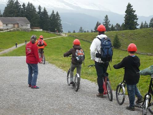 Nach dem Essen wanderten zurück zur Bergstation, da wartete der Junge der Kopfschmerzen hatte im Restaurant auf uns. Nach der Wanderung besammelten wir uns bei der Bergstation und dachten, wir müssten ins Tal runter laufen. Aber plötzlich fragte uns Herr Zwicky, ob wir mit der Sesselbahn herunterfahren wollen. Doch danach erzählte er uns, dass er schon Trottinett gemietet hat! Darüber freuten sich fast alle. Schnell rannten wir zu den Trottinetts. Dort erklärte uns eine Frau die Regeln der Fahrgeräte und andere Sachen. Helme mussten wir für unsere Sicherheit tragen.