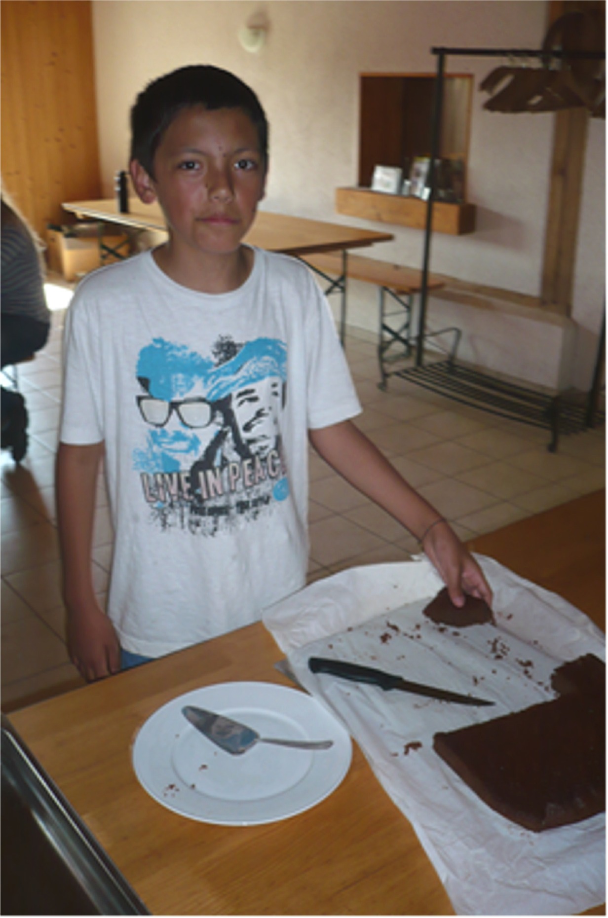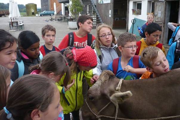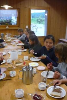 Nach etwa zehn Minuten liefen wir zurück. Als wir zurückkamen war eine 3.Oberstufen Klasse hier. Sie übernachten eine Nacht hier, aber nicht bei uns im Stroh. Der Zvieri war schon bereit. Es gab Schokoladenkuchen.