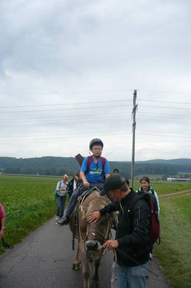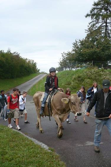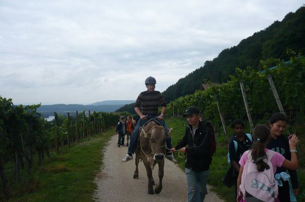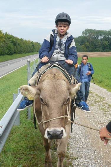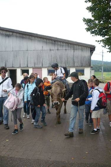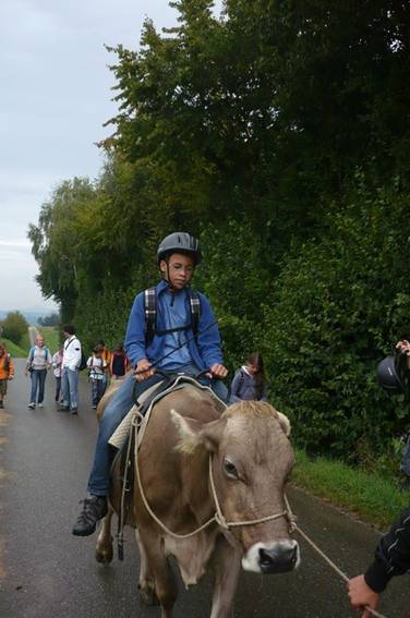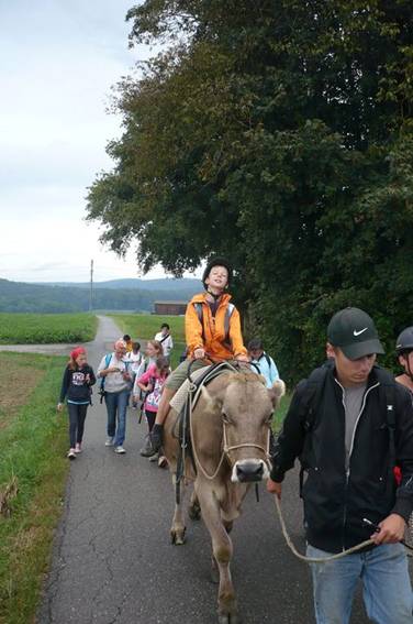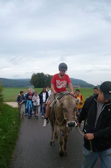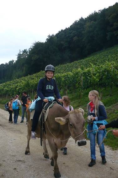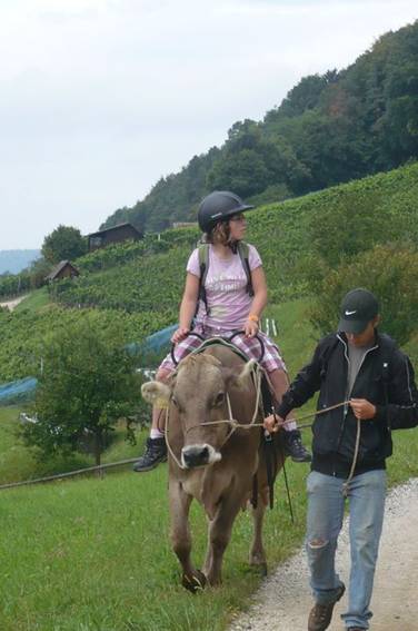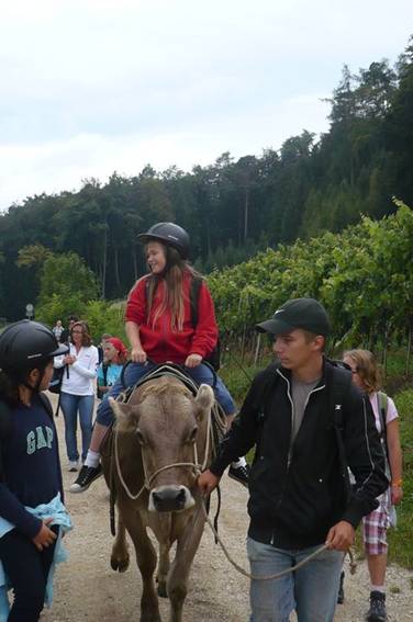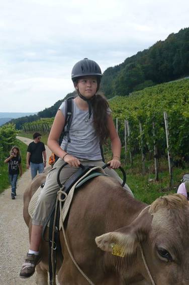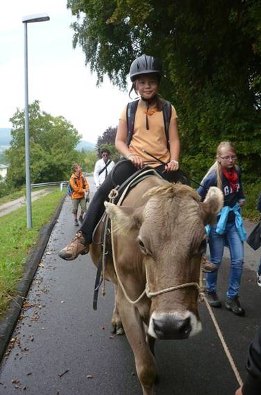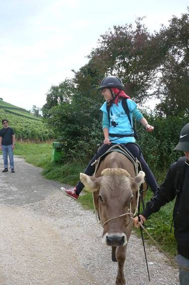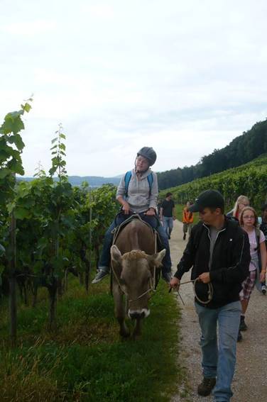 Der Weg führte durch die Weinberge mit Blick auf den Rhein. Es war wunderschön. Sogar Herr Zwicky durfte am Schluss Reiten, die Kuh sah glücklich aus.