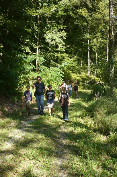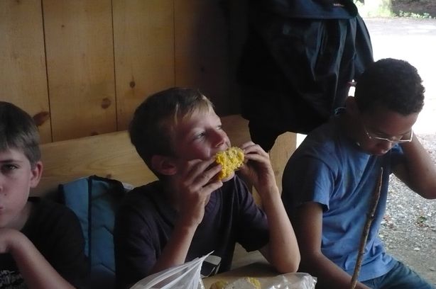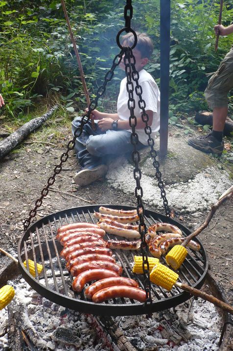 Den ganzen Weg mussten wir sehr steil hinauf trampeln. Nach 90 Minuten kamen wir an der Grillstelle an. Leider hatten wir aber Grillzangen vergessen, weshalb alle Spiesse zum Wenden der Würste schnitzen mussten. Zum Glück hatten zwei Kinder, Paolo und Alexander, ihre Taschenmesser dabei. Wir assen Cervelats und Bratwürste vom Hof. Dazu gab es Maiskolben, Karotten und Brot.