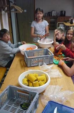Nach den Ämtlis spielten sie etwas, aber leider „machte“ ein Huhn auf Estellas T-Shirt. Darauf musste Estella das T-Shirt wechseln. Zum Nachtessen gibt es Riz Casimir. Es riecht sehr lecker aus der Küche. Nach dem Nachtessen werden wir im Stroh auf einer grossen Leinwand einen Film schauen. Alle freuen sich auf den Abschlussabend.