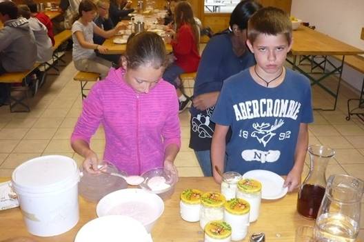 Jetzt gab es Frühstück. Die Kinder assen ungeduldig. Das Frühstück bestand aus selbst gemachtem Brot, drei verschiedene Konfitüren, Schinken, Salami, Fruchtjoghurt und diversen Getränken.