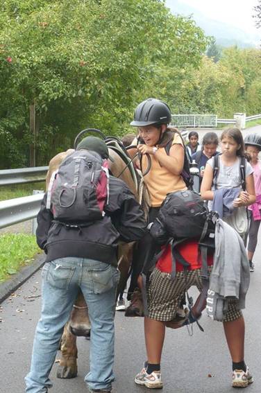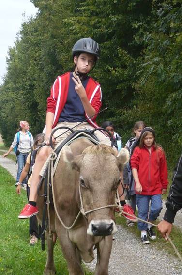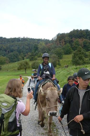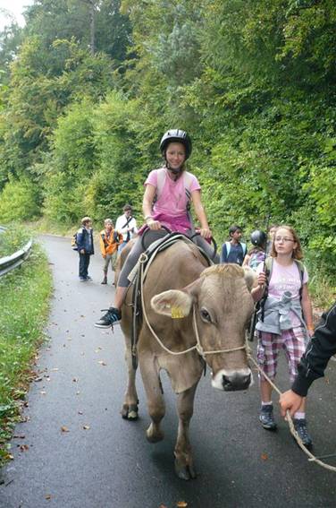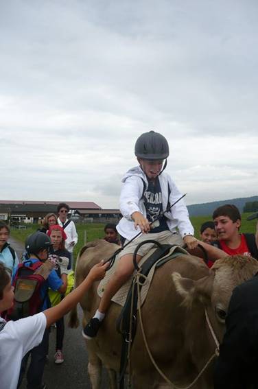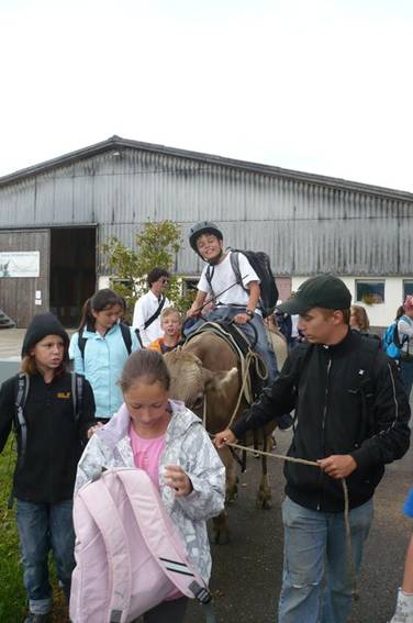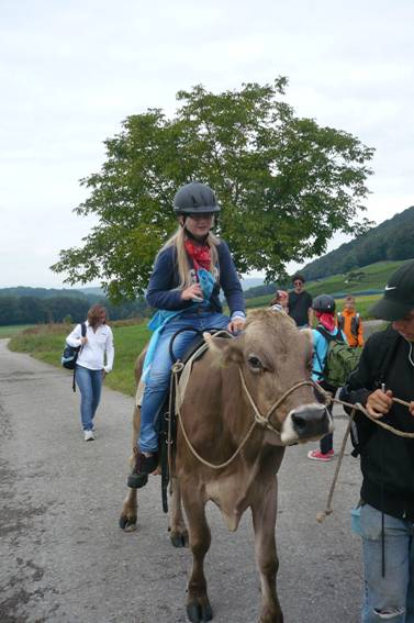 Danach ging das Kuhreiten los, denn auf unsere heutige Wanderung nahmen wir eine Kuh mit, auf der man reiten konnte. Alle freuten sich sehr darauf.