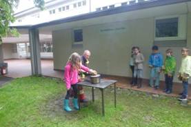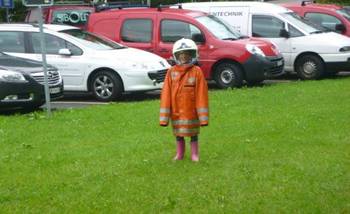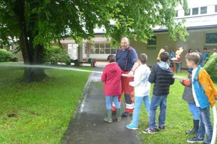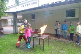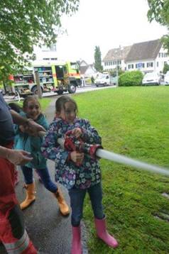 Umso mehr man drehte umso Breiter wurde der Strahl. Wenn man den Schlauch ganz aufdrehte wurde der Schlauch ganz breit. Man musste stark sein, dass man überhaupt den Schlauch halten könnte, sonst wurde man auch nach hinten geschleudert. Bei einem Posten hatte es einen brennende Pfanne. Alle Kinder aus der Klasse durften das Feuer in der Pfanne löschen, zuerst mit dem Pfannendeckel, dann mit der Löschdecke. Beim Posten Feuerwehrauto durften wir die Ausrüstung anziehen. Ein paar Kinder waren gleich schwer oder sogar leichter als die Ausrüstung (die Ausrüstung war 30 kg schwer) deshalb brachen ein paar Kinder fast zusammen.