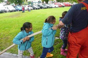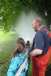 Hier werden gerade die Kinder die möchten von anderen Kindern abgespritzt. Während wir abgespritzt wurden, hatten wir einen Feuerwehr Mantel und Helm an. Der Strahl war recht stark. Das hat uns Kindern am meisten Spass gemacht.