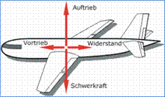 Kräfte am FlugzeugeBeim Fliegen wirken am Flugzeug verschiedene Kräfte zwar Vortrieb, Luftwiderstand, Auftrieb, Schwerkraft und die Erdanziehungskraft.