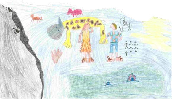 26. Ziemlich knapp! Phil ist nur noch 2 Meter von der Spinnenschar entfernt. Mutter versucht Phil hochzuziehen, aber es geht nicht. Jetzt ist die Spinnenherde nur noch 50 cm von Phil entfernt und da erreichen sie Phils Fuss. Phil schreit: „ Das ist mein Ende!!!“ Doch da passiert etwas, das er nicht erwartet hat. Durch die Masse der Spinnen drückt es ihn hoch und bald steht Phil nicht mit Absicht, aber mit der Hilfe der Spinnen oben am Rand. Schnell rennen sie den Klippen entlang. Da entdeckt Mutter eine Felsspalte. „Schnell da rein!“ Drinnen in der Spalte hat es eine Lücke, durch die man in eine Höhle kommt. Da erschrecken Mutter und Phil noch einmal. An der Wand sind Höhlenmalereien. Sie zeigen ein komisches Tier mit einer Nilpferdschnauze, einem Leopardenfell, einem Nashornshorn und einem Hasentummelschwanz, das Oculus heisst. Plötzlich macht es RATSCH! Ein Fels verdeckt den Eingang und schnell wird ihnen klar, dass sie eingesperrt sind! Da sehen sie einen kleinen Lichtschimmer! Ist das die grosse Rettung?