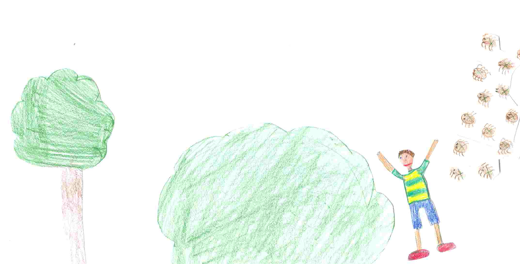 und Mutter verstecken sich hinter dem Gebüsch. Mutter sagt: „Die sind wir