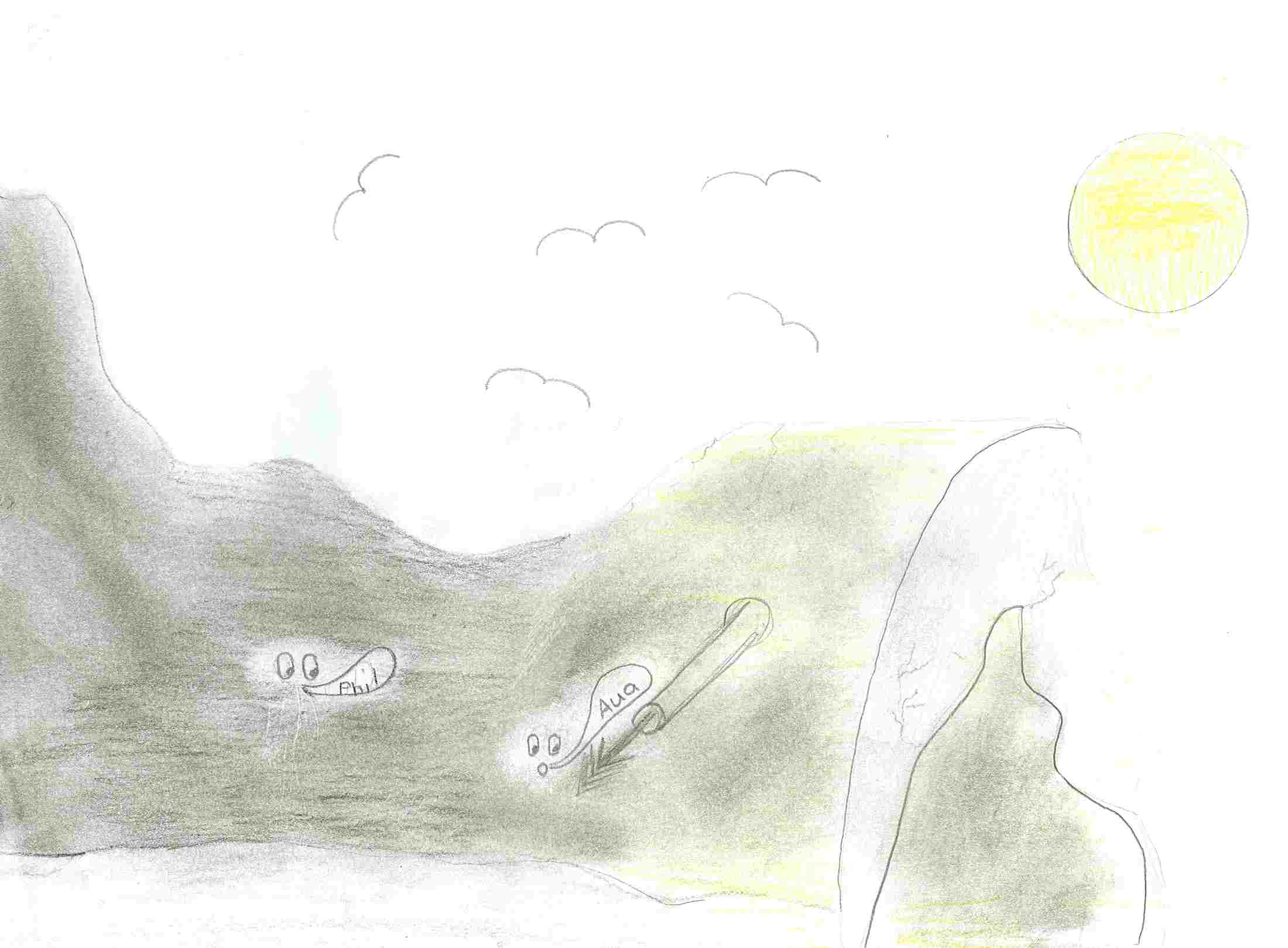 47. Der Felsbrocken Phil und Mutter rennen und rennen. Sie rennen in einen Felsbrocken. Der Felsbrocken öffnete sich und sie spicken nach draussen, direkt in einen See. Phillip prustet: „Tolle Erfrischung aber wo ist Nico?“ Mutter antwortet: „Wohl nicht in diesem See!“ Sie schwimmen ans Ufer. Da kommt ein Wildschwein ihnen entgegen. Sie klettern auf eine Palme. Phil fällt fast herunter, aber die Mutter kann ihn gerade noch an den Haaren festhalten. Sie sehen eine Liane an der schwingen sie sich auf einen riesigen Baum. Dort sind sehr viele Affen die sie glatt herunter schupsen. Zum Glück waren sie nicht so hoch. Sie fallen auf einen Weg und gehen weiter.