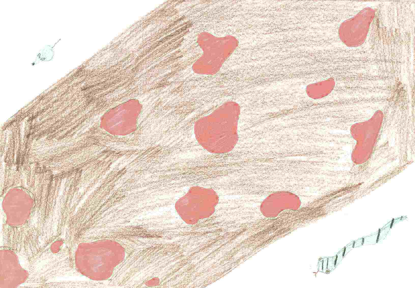 55. DAS BLUT !!! Mutter und Phil gehen voller Schrecken den Blutspuren entlang. Sie finden es total hässlich. Plötzlich sehen sie etwas Schreckliches am Boden. Phil sagt ganz ängstlich: „Das kann nicht Nico sein!“ Mutter antwortet: „Stimmt, komm wir sehen uns das mal näher an.“ Phil ist einverstanden. Sie gehen langsam an das schreckliche Etwas heran. Da erkennen sie, dass es eine Papierrolle ist. Sie öffnen das Pergament. Darauf steht: Geheimplan Wir wollen eine falsche Fährte! Darum der Schuh vom Jungen mit Nilpferdblut. Grüsse krummer Säbel. „Hä was für ein Nilpferd?“, fragt Mutter. Sie nehmen den Zettel mit und gehen weiter. Mutter ruft: „Schau mal Phil!“