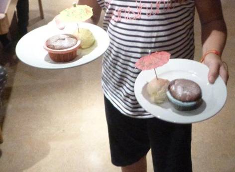 Leider kam das Essen sehr spät, es kam um ca. 20:00. Dann gab es eine kleine Pause. Die Muffin Prinzessinnen haben in dieser Zeit Muffins gemacht. Als alle fertig waren, gab es Muffins. Dazu gab es noch Vanille Eis und schöne süsse Schirmchen oben drauf. Etwas ganz Wichtiges haben wir vergessen, es waren Schoko Muffins mit flüssiger Schokolade drinnen, sie kamen direkt aus dem Ofen. Es war auch sehr schön dekoriert und dann gingen wir eben schlafen.