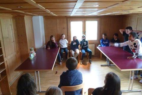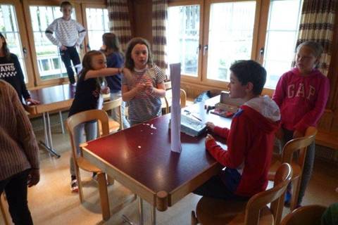 Dann machten wir so eine Art Wettkampf, es gab 5 Gruppen. Wir machten In- und Outdoorspiele. Wir rannten in der Gruppe um den Schwendi See, oder bauten nur mit Papier und Schere einen Turm, wir schossen auch Büchsen und spielten Wilhelm Tell. Als erstes mussten wir zum Schwendi See nach draussen da es übrigens immer noch kalt und neblig war, also dann machten wir uns auf den Weg zum Schwendi See.
