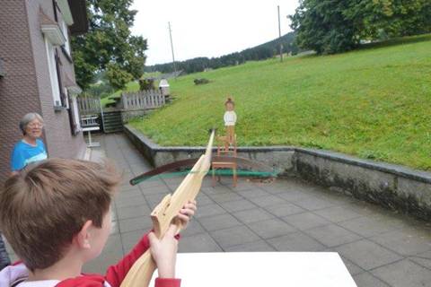 Als wir Pause hatten, konnte man Armbrustschiessen üben, einige Kinder haben es geschafft und Walterli noch einmal getroffen. Aber Walterli hatte nicht so viel Glück, er wurde an den Augen getroffen und auch an den Beinen. Alle Begleiter haben es dann auch noch probiert.