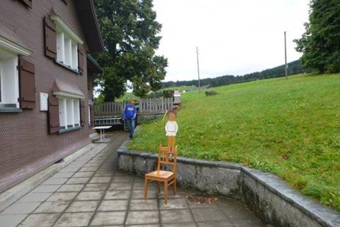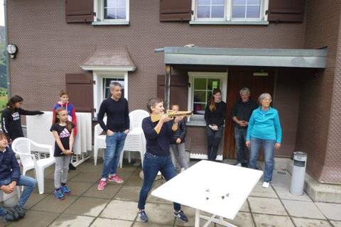 Der nächste Posten ging so, wir mussten dem Walterli den Apfel vom Kopf schiessen mit einer Armbrust. Also wir spielten Willem Tell, aber nur zwei Kinder spielten die Rolle richtig und schossen den Apfel von dem Kopf. Es war sehr schwierig zu treffen aber wie gesagt, ein Junge und ein Mädchen haben es geschafft. Es war schwierig, weil der Pfeil nach links oder nach rechts flog, aber sonst war es sehr lustig.