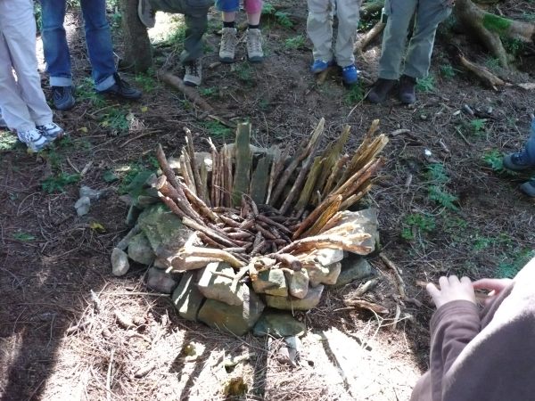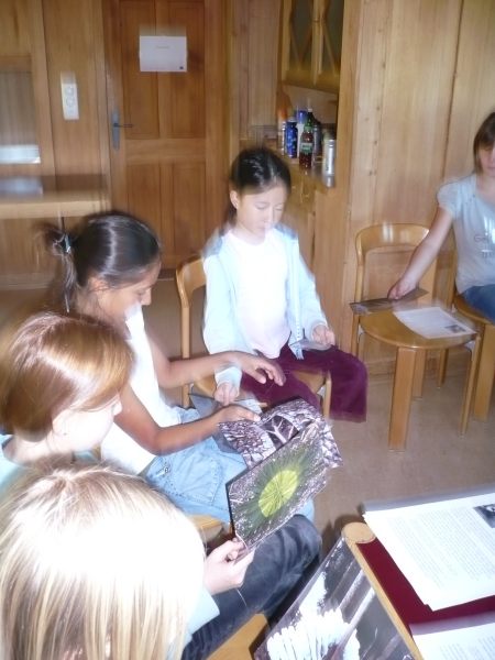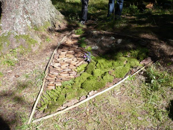 Wir assen Frühstück, es gab Fleisch; Käse, Früchte, Confitüre, Kakao, Orangensaft und Milch. Nach dem Frühstück machten wir die Sandwichs, dann holten wir den Eistee den Frau Müller und Frau Schwander aufgefüllt haben. Dann schauten wir die Kunstwerke von Andy Goldsworthy an. Dieser Künstler macht aus natürlichen Sachen Kunstwerke; aus Lehm, Steinen, Moos, Farn, Blättern, Holz oder Blüten. Wir zogen die Wanderschuhe an und gingen dann auf den Spaziergang. Wir liefen die letzten Meter zu unserem Picknickplatz. Herr Zwicky teilte uns in fünf Gruppen ein. Jede Gruppe musste ein Kunstwerk mit Dingen die wir in der Natur finden bauen. Um 13 Uhr gab es die Sandwichs die wir selbst gemacht haben und die Wienerli im Teig von gestern. In einem davon war ein Stück Aluminium versteckt. Flurin fand es und gewinnt einen noch unbekannten Preis. Anschliessend schauten wir die Kunstwerke der Gruppen an. Sie waren alle sehr schön. Wie Andy Goldsworthy verwendeten wir Holz, Moos, Tannzapfen, Steine, Farn und Blüten.