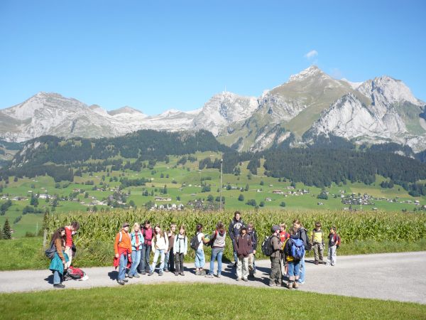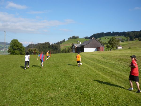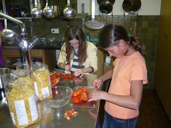Wir spazierten um 3 Uhr nachmittags zurück zum Lagerhaus. Dort spielten wir Tischtennis, Fussball und andere Sachen. Es hat uns sehr Spass gemacht. Die Küchengruppe ging in die Küche. Zum Abendessen assen wir Salat, „Älplermakronen“ und zum Dessert Coupe Dänemark. Es war sehr fein, aber die Makronen schmeckten uns besonders gut.