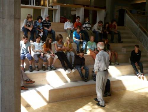 Wir setzen uns auf eine Tribüne in dem Haus und dort empfing uns Herr Frommherz, ein Mitarbeiter des Sensoriums. Er gab uns eine Einführung in die verschiedenen Posten.