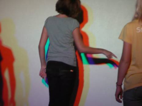 Es gab sechs verschieden farbige Schatten. Dann drehten wir uns um, dort war eine schwarze Leinwand mit einer weissen Leinwand in der Mitte die eine Gasse zeige. Jetzt nahm Herr Frommherz Anthony raus. Plötzlich erschien er auf der weissen Leinwand und stand auf dem Kopf. Herr Frommherz erklärte uns, dass es eine Camera Obscura war. Ausserhalb des Raumes waren Spiegel. Sie waren verschieden gebogen, so dass man im einen Spiegel dünn und im anderen dick war.