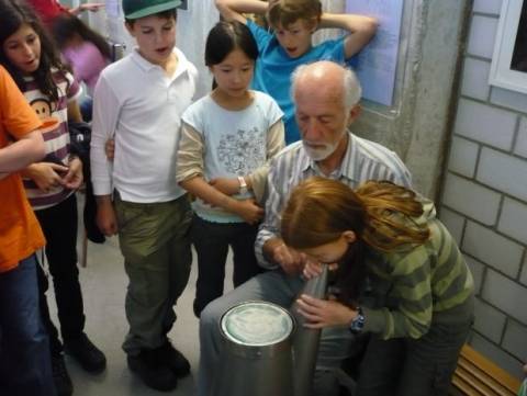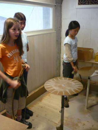 Danach führte uns Herr Frommherz zu einem Stuhl der von vielen Seiten beleuchtet werden kann. Das führt dazu, dass das Gesicht, das beleuchtet wird, nie gleich aussieht. Dann gingen wir in einen dunklen Gang, in dem ein Geländer an Tischen vorbeiführte. Auf den Tischen waren Sachen, die wir ertasten mussten. Dann gingen wir in einen Raum, in dem es einen Gong hatte. Der nächste Posten war ein Klangposten. Auf dem Foto seht ihr das Instrument, mit dem ein Mädchen Sand auf einer Gummimembran verschoben hatte. Dazu musste es laut in eine Röhre kreischen.