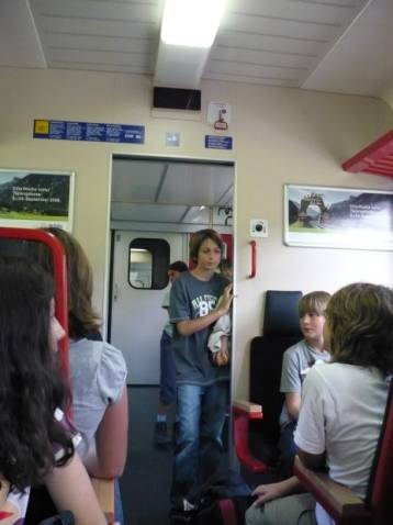 Jetzt mussten wir wieder 30 Minuten zu Fuss zum Bahnhof laufen. Filipe ging weit voraus. Als wir beim Bahnhof waren, kam nach etwa 10 Minuten der Zug. Im ersten Zug mussten wir 8 Minuten fahren, dann mussten wir umsteigen. Mit dem zweiten Zug mussten wir nur eine Haltestelle fahren. Ich fand die Fahrt zu kurz, man konnte nämlich fast nicht anfangen zu spielen.