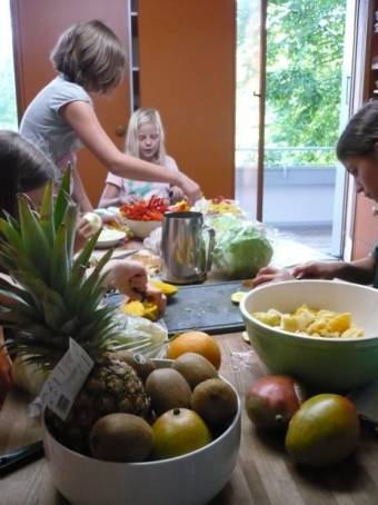Savana, Larissa, Julia, Tamara und Joëlle machen uns heute Fajitas, das wird sicher fein. Zum Dessert gibt es dann Früchtespiesschen mit Schoggiüberzug. Ich freue mich sehr auf das Essen, weil ich Hunger habe. Während ich am Schreiben sitze, sieht es in der Küche so aus: