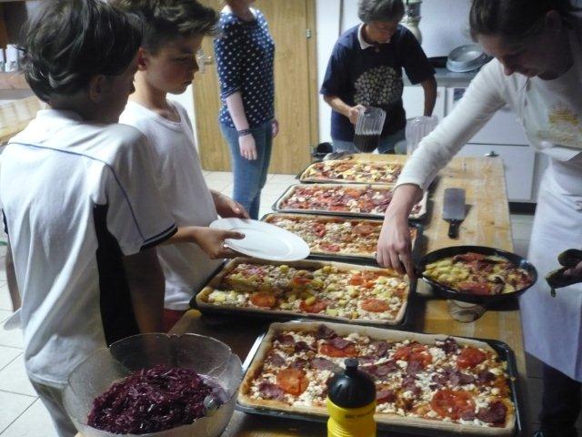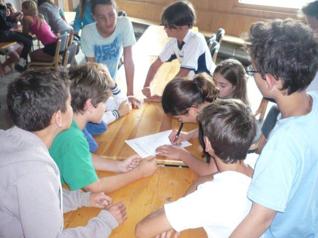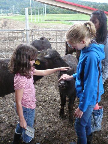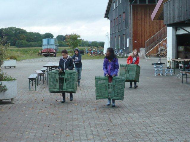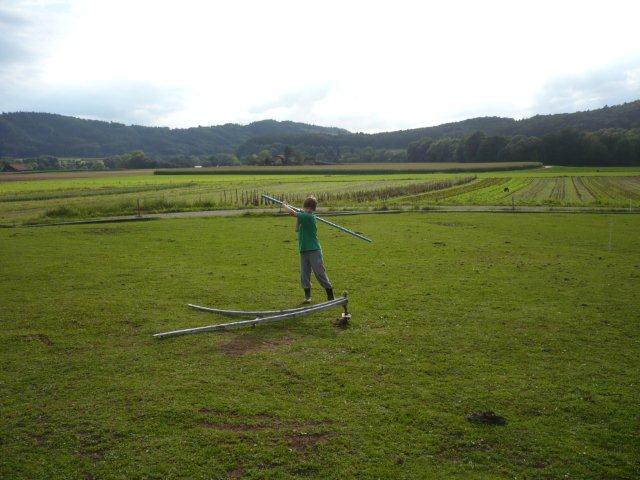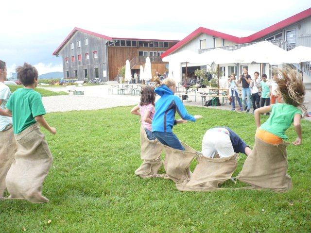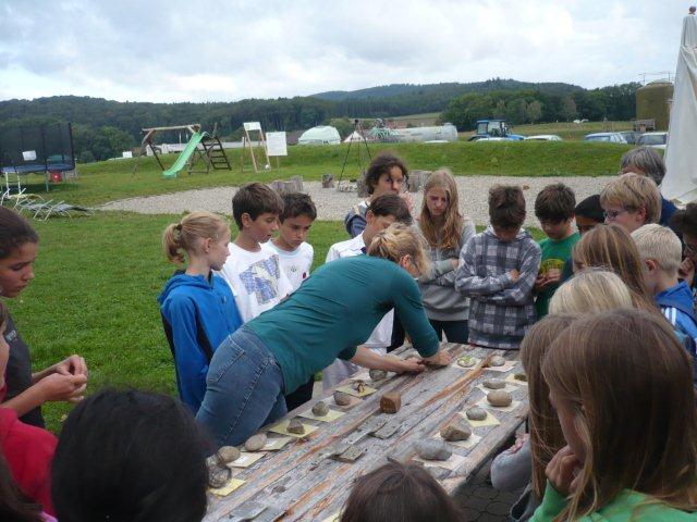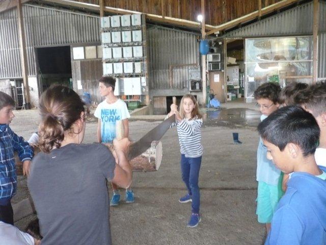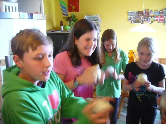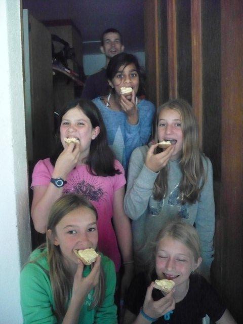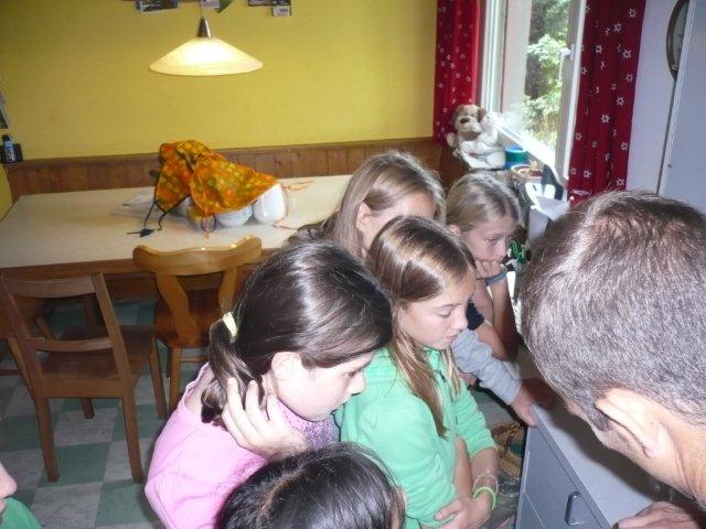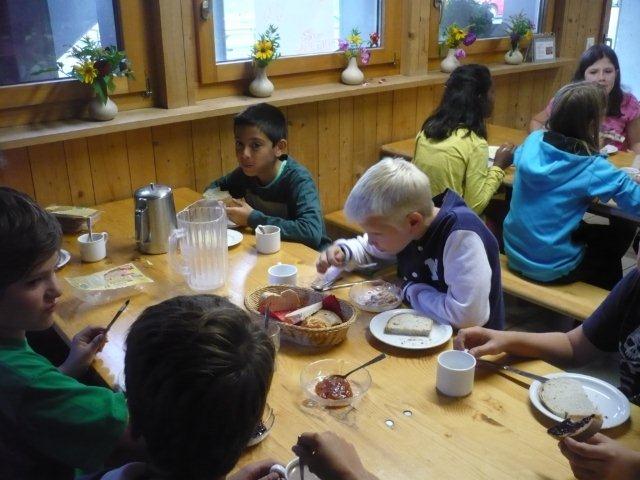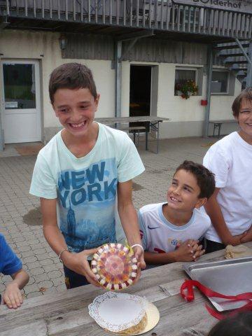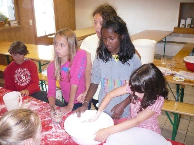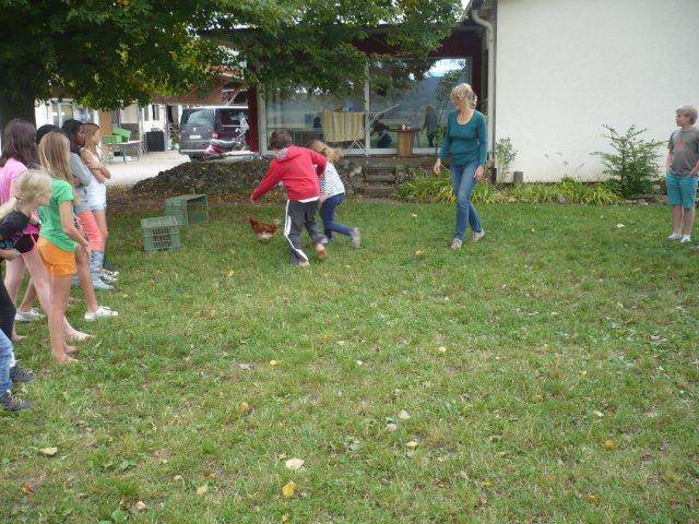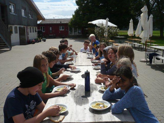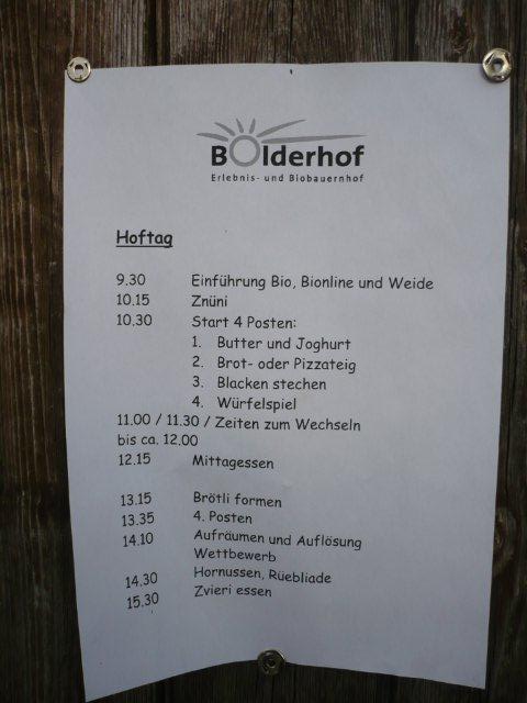 Maxi, Tarah-Faye, Daria, Thomas, Philipp und Laila Es gab noch ein Würfelspiel, bei dem man nach dem Würfeln Kärtchen aufdecken musste, auf denen verschiedene Aktivitäten geschrieben waren, die man ausführen musste. Danach ging die nächste Gruppe zum Brot- und Pizzateig kneten, den wir für den Znacht gemacht haben. Als dieser Posten vorbei war, gab es Mittagessen. Zum Mittag gab es Suppe mit Brot. Manche Kinder assen nur Brot. Nach dem alle aufgegessen hatten, gingen wir in den Esssaal um Brötli für den Zvieri zu formen. Es gab vier Posten, die wir noch machen mussten. Der eine Posten war Sackhüpfen, bei dem 4 Säcke aneinander genäht waren, weshalb immer vier auf einmal pro Gruppe sprangen. Danach gingen wir Hühner fangen, das ging so: Jedes Kind bekam eine Zahl zugeteilt, die dann aufgerufen wurde und die beiden Kinder rannten dann dem armen Huhn hinterher um es einzufangen. Wenn es Frau Morgenegg gebracht wurde, bekam die Gruppe einen Punkt. Nachher gingen wir zum Gummistiefel werfen in den zwei Gruppen Wasserbüffel und Chickenwings. Alle fanden es sehr schwer, weil man unter den Beinen hindurch, über den Rücken nach vorne schiessen musste. Aber ein Junge schaffte es, den Gummistiefel 5-7m weit zu werfen. Dann gingen wir zum nächsten Posten, nämlich zum Karottenparcours, das Team Chickenwings gewann. Es stand 3:1 für die Wasserbüffel. Danach mussten zwei Kinder von je einer Gruppe eine grosse Säge nehmen und ein Stück Holz absägen. Alle fieberten mit und schrien: "1,2,1,2!" Wir fingen fest an zu sägen, bis Frau Morgenegg zu den Wasserbüffeln sagte: „Ihr müsst noch mal anfangen", weil sie in einem Schnitt angefangen hatten, der schon fest angesägt war. Die Gruppen rannten ins nahe liegende Haus, dort beantworteten wir Schätzfragen. Als wir endlich alles fertig korrigiert hatten, freuten sich alle Kinder auf’s Nagelspiel. Dabei haute sich zwar ein Kind auf den Finger, trotzdem war es lustig. Man musste möglichst schnell sechs Nägel in einen Baumstamm reinschlagen. Jede Person durfte immer nur einen Schlag auf den Nagel setzen. Als alle hungrig von der Rüebliade zurückkamen, assen wir unsere leckeren, selbst gemachten Brötli. Ein Kind hatte heute Geburtstag und alle gratulierten ihm, er bekam als Überraschung eine Gummibärchentorte. Nach einer kurzen Pause gingen alle zu ihren Ämtlis. Zum Znacht gab es leckere Pizzas, auch wieder mit dem selbst gemachten Teig. Es war so gut, dass es alle genossen haben. Nach dem Essen spielten wir auf dem Feld „Hornussen“. Das Spiel nennen sie auch Bauerntennis. Danach machten sich alle bereit für’s Schlafen und gingen friedlich in den Schlafsack.