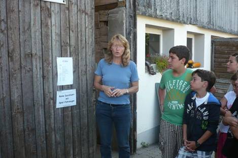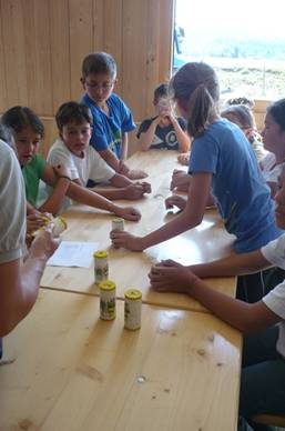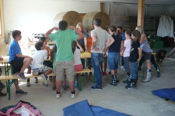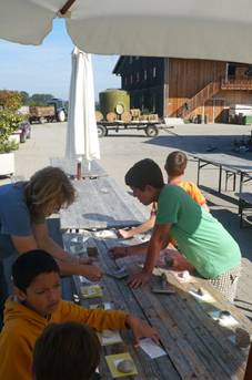 Auf diesem Bild setzten wir das "Puzzle" zusammen. Nach dem Puzzle bewegten wir uns auf dem Weg in Richtung der Weide fort. Auf der Weide selbst, fragte uns Frau Morgenegg, welches Kraut die Kühe am liebsten verschlingen und welches sie nicht mögen! Zusammen fanden wir heraus, dass sie das Kraut "Wegerich" nicht gerne in ihre Mägen rutschen lassen. Nach diesen Infos gingen wir wieder zurück zum Hof. Heute gab es etwas anderes als Wandern und was wir an den anderen Tagen machten. Es gab verschiedene „Posten“. Nämlich Zwiebelnwettsammeln bei Kamal auf dem Feld, ein Würfelspiel mit Dingen die man auf dem Hof machen musste, dann gab es eine Gruppe die Brotteig herstellte und noch eine Gruppe die Butter und Joghurts machten. Es gab bei dem Zwiebelnsammeln auch einen Wettbewerb. Die Gruppe die am meisten Kisten füllte gewinnt. Hier sieht man den „Würfelspielposten“. Es gab nämlich Karten, auf denen stand was man machen muss.