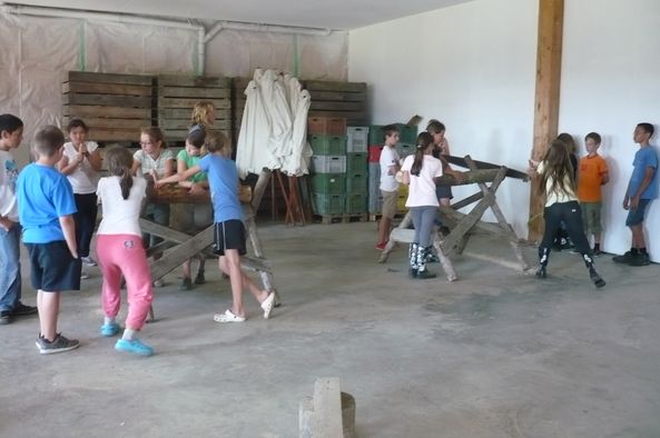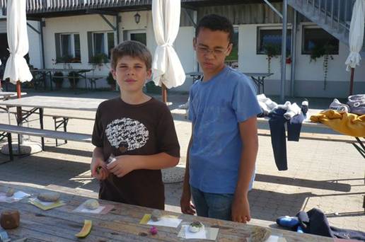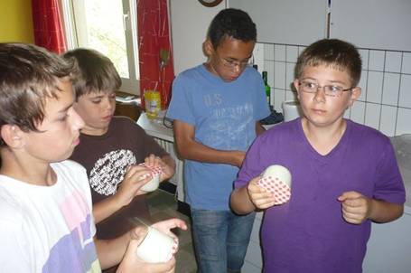 Dies ist die „Zwiebel-sammel-Gruppe“, die schnell Zwiebeln in die Kisten füllt. Es war sehr anstrengend, doch eine Pause durfte man sich nicht gönnen, weil man nur eine halbe Stunde Zeit hatte! Hier sieht man, wie eine Gruppe Butter und Joghurt macht. Das Joghurt essen wir nämlich morgen zum Frühstück.