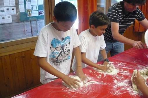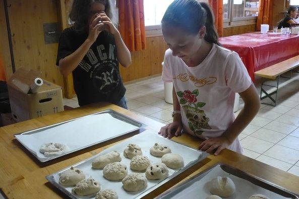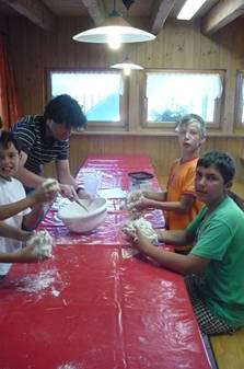Rahm wird in einer Tasse geschüttelt, der dann zu Butter wird. Die Butter assen wir dann mit Brötchen. Es war erstaunlich, das man nur Rahm schlagen muss und dann wird es schon zu Butter! Es hatte keinen starken Geschmack. Es schmeckte anders als die normale Butter die man kaufen kann. Doch es war sehr fein. Ein Posten war Brot backen. In Gruppen wurde Teig hergestellt. Ein Teig war dafür vorgesehen, Zvieribrötli für uns herzustellen.
