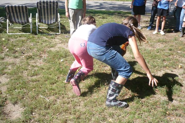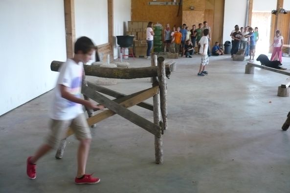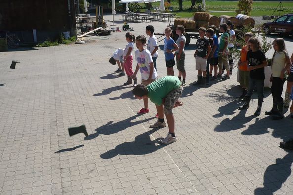 Hier liessen wir unsere Geschicklichkeit spielen, denn das war die Rüeblistaffete. Jeder musste eine Karotte auf einem Löffel über eine Wippe am Anfang jonglieren, nachher schnell auf einer Stange balancieren und rund um einen Bock laufen und dann schnell wieder zurück eilen. Das Sägen gab keine Punkte, denn es war ein gefährliches Spiel. Trotzdem kamen alle ohne eine Wunde aus.