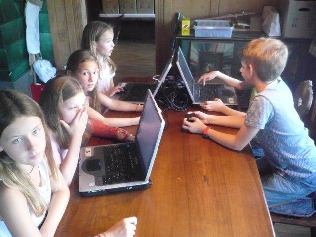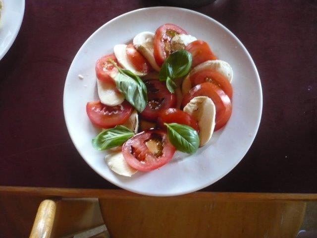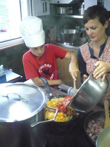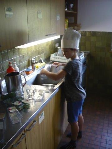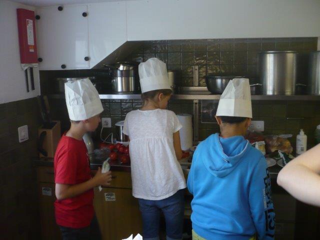 Dann kamen wir noch an einem Posten vom Klangweg vorbei. Dort konnte man mit Holzstöcken Metallbuchstaben schlagen und so erzeugte man schöne Töne. Danach gingen wir wieder zurück zum Lagerhaus. Nun machten sich die Kochkinder an die Arbeit. Die Kinder, die den Tagesbericht schreiben, haben auch angefangen. Heute gibt es Spaghettiplausch, das ist Spaghetti mit verschiedenen Saucen, in diesem Fall sind es folgende Saucen: Tomatensauce, Pesto und Carbonara. Wenn man in die Küche kommt, bekommt man gerade Hunger! Zur Vorspeise gibt es Tomatenmozzarellasalat.
