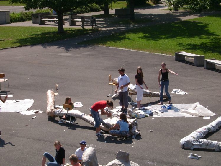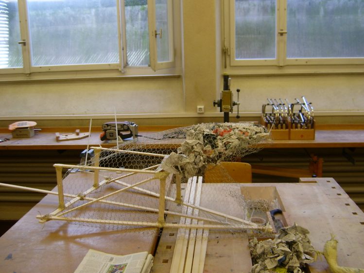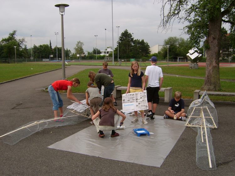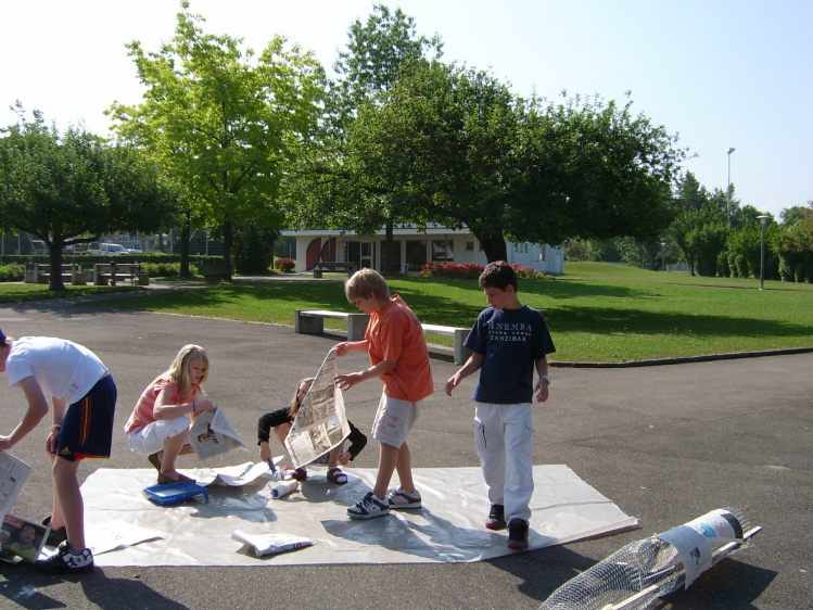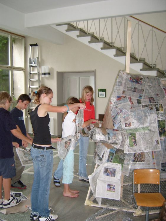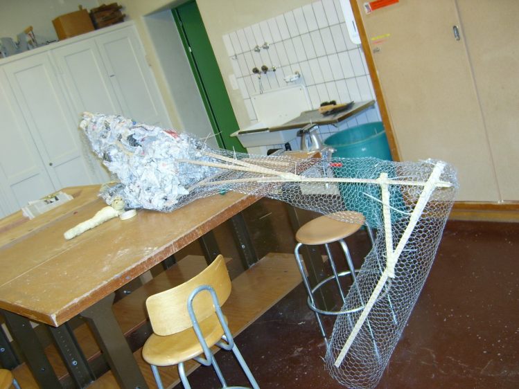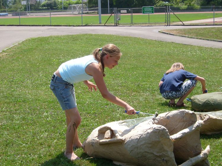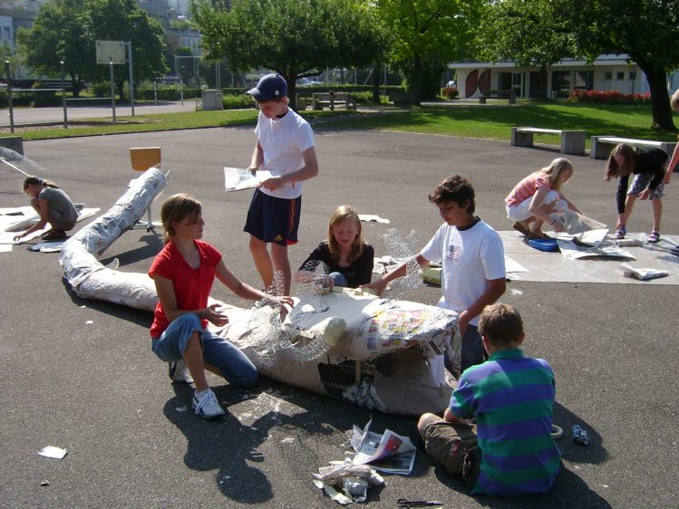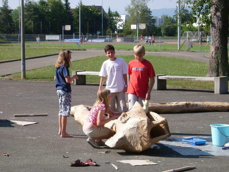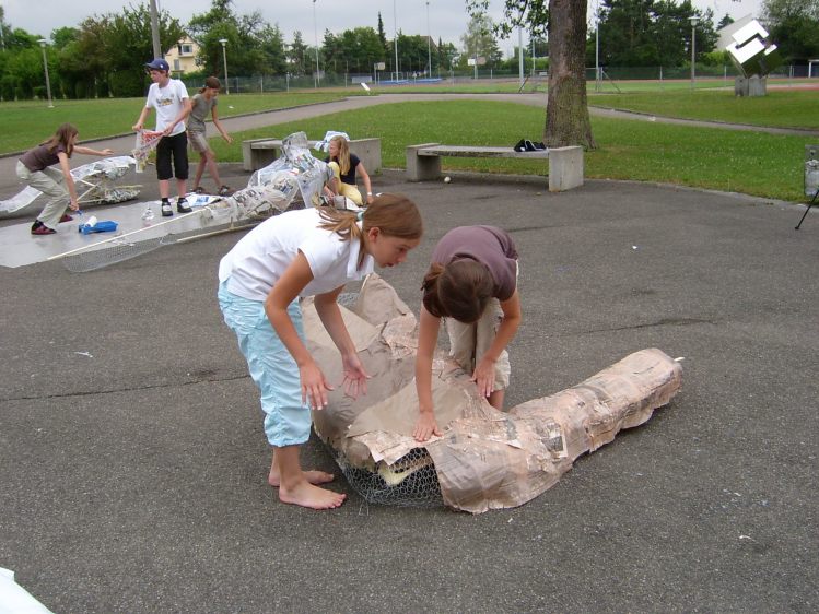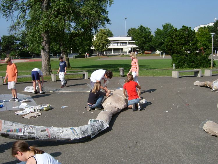 Als Abschluss nach 3 Jahren Mittelstufe haben wir dem Schulhaus ein "Getier" hinterlassen. Während einer Woche wurde mit Holz, Gitter und viel Kleister gearbeitet ...