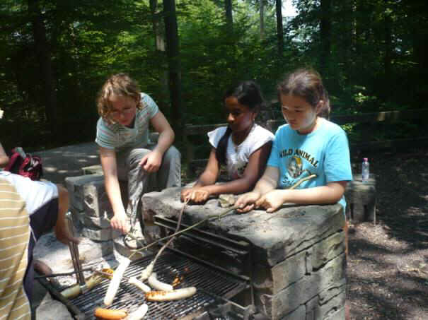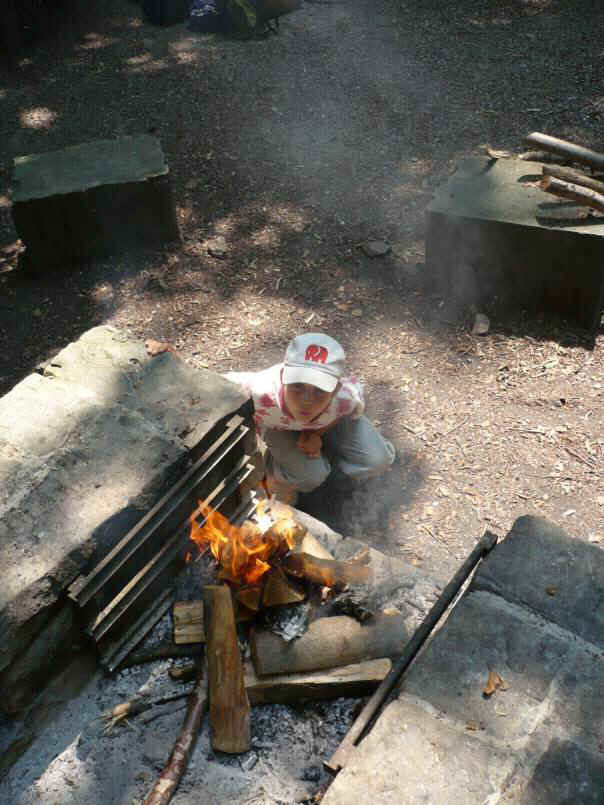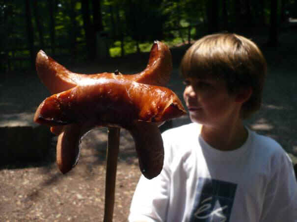 Alle haben ihre Würsten auf einen spitzigen Ast gesteckt und haben sie übers Feuer gehalten.
