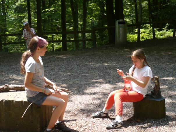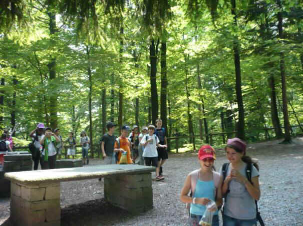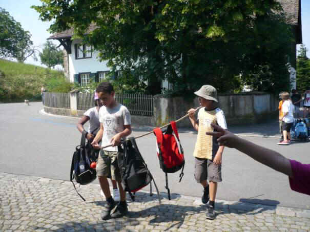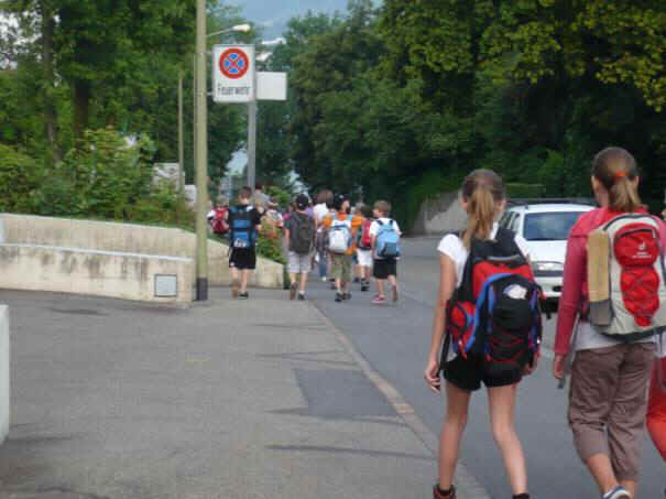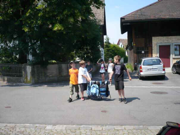 Herr Zwicky und die Begleiterin Frau Lebrecht warteten vor dem Schulhaus Oescher B. Fast alle waren da, drei Mitschüler verspäteten sich. Als alle da waren, überprüfte Herr Zwicky ob alle da waren. Danach gab uns Herr Zwicky Notfalltelefonnummern. Wenn sich ein Kind in der Stadt verläuft und dann kann das Kind jemand fragen ob jemand ein Handy hat, dann kann das Kind telefonieren. Dann gab uns Herr Zwicky Holzstücke aus einer Kiste, wir mussten sie bis am Wald tragen, dort machten wir dann aus den Holzstücken Feuer. Endlich gingen wir und die Schulreise fing an.