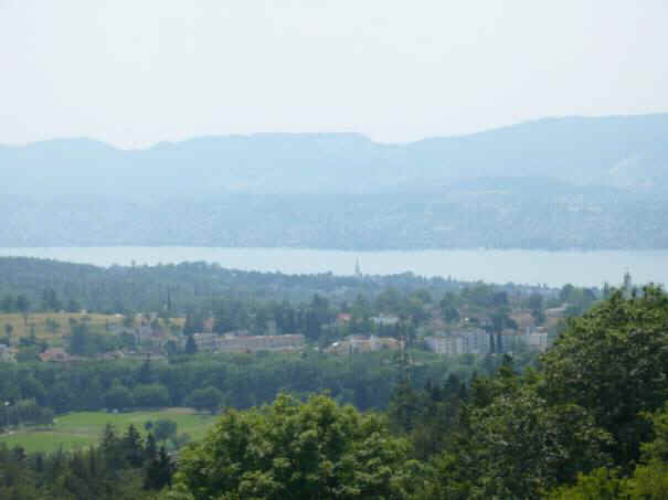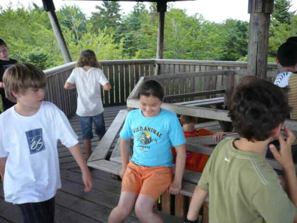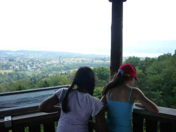 Ein paar Kinder spucken runter, Upps! Ein Volltreffer. Jetzt kommt Frau Lebrecht rauf. Alle tun so als wäre nichts passiert. Herr Zwicky ist jetzt auch oben. Ein paar Kinder fotografieren die Aussicht und uns Kinder. Wir geniessen die Aussicht.